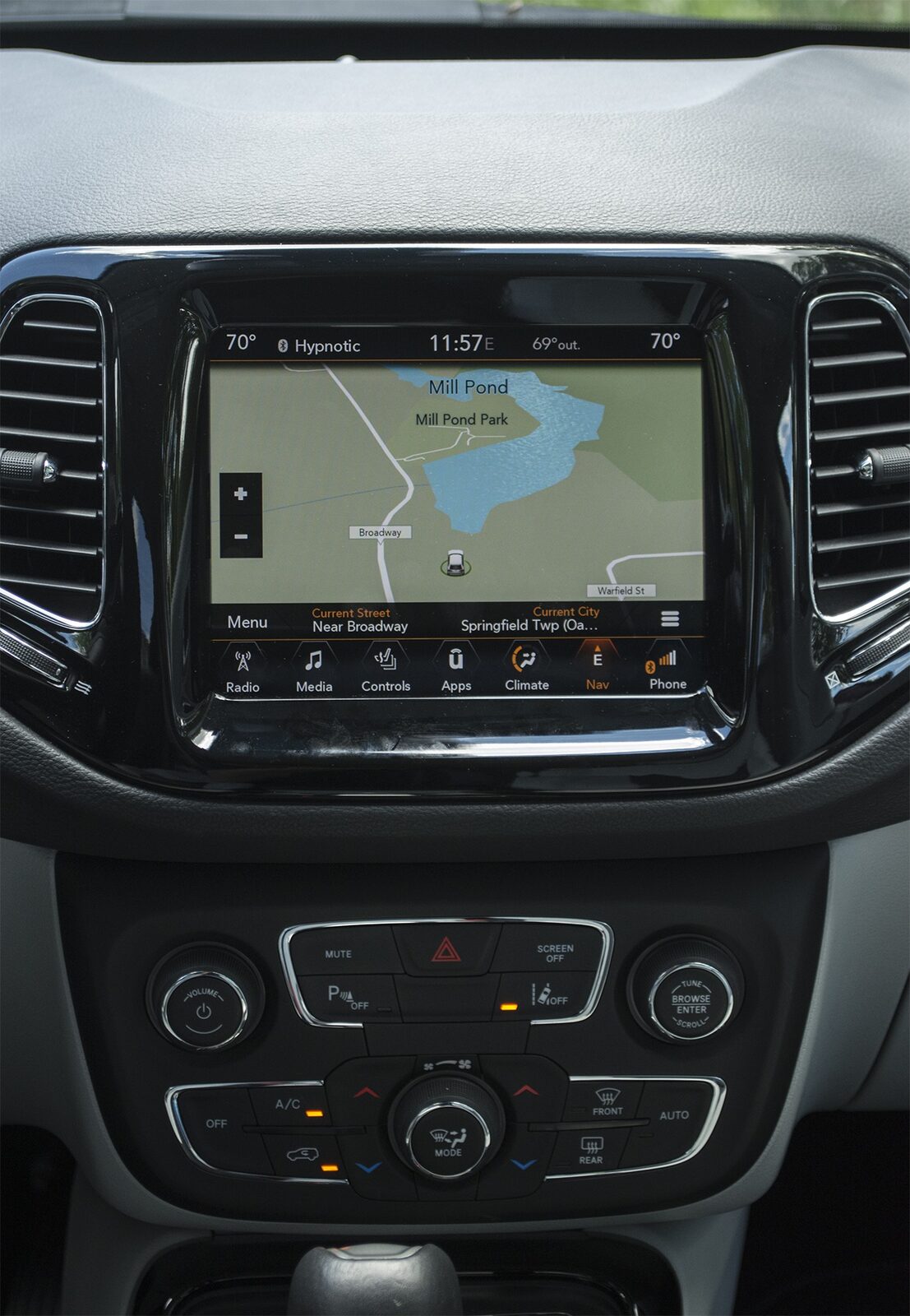 Closeup of the 2017 Jeep Compass Limited 4X4 Uconnect infotainment screen showing a navigation map with the Mill Pond Park area. The 8.4-inch touchscreen interface includes easy-access tabs for radio, media, controls, apps, climate, navigation, and phone.