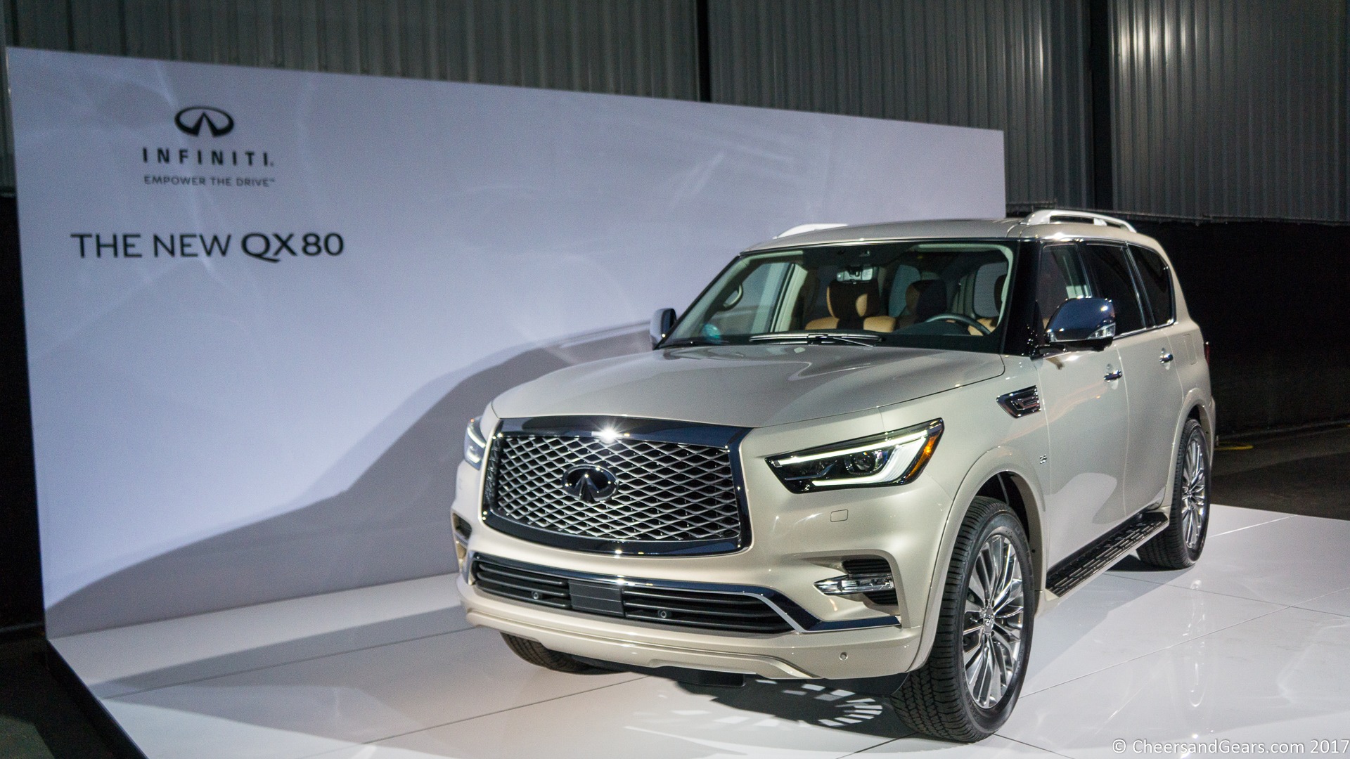 Head-on view of the 2018 Infiniti QX80 in champagne silver showcasing the redesigned double-arch grille and signature LED headlights. The reveal backdrop highlights the QX80's bold new front fascia for the post-facelift generation.