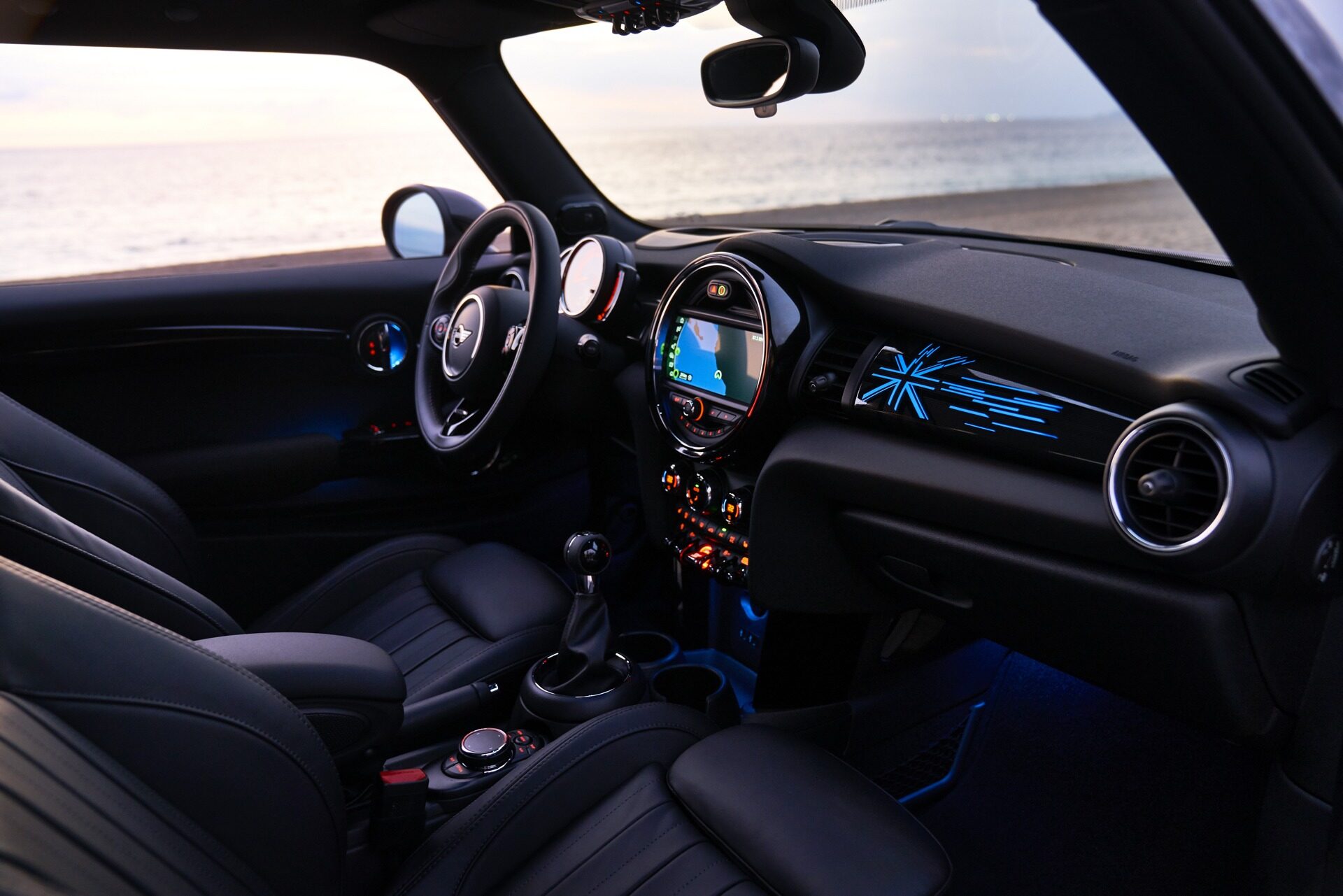 The dark cabin of the 2019 Mini Cooper S Hardtop is illuminated by blue Union Jack ambient LED lighting on the dashboard, framing the round center infotainment display that anchors the retro-inspired interior design of the refreshed model.