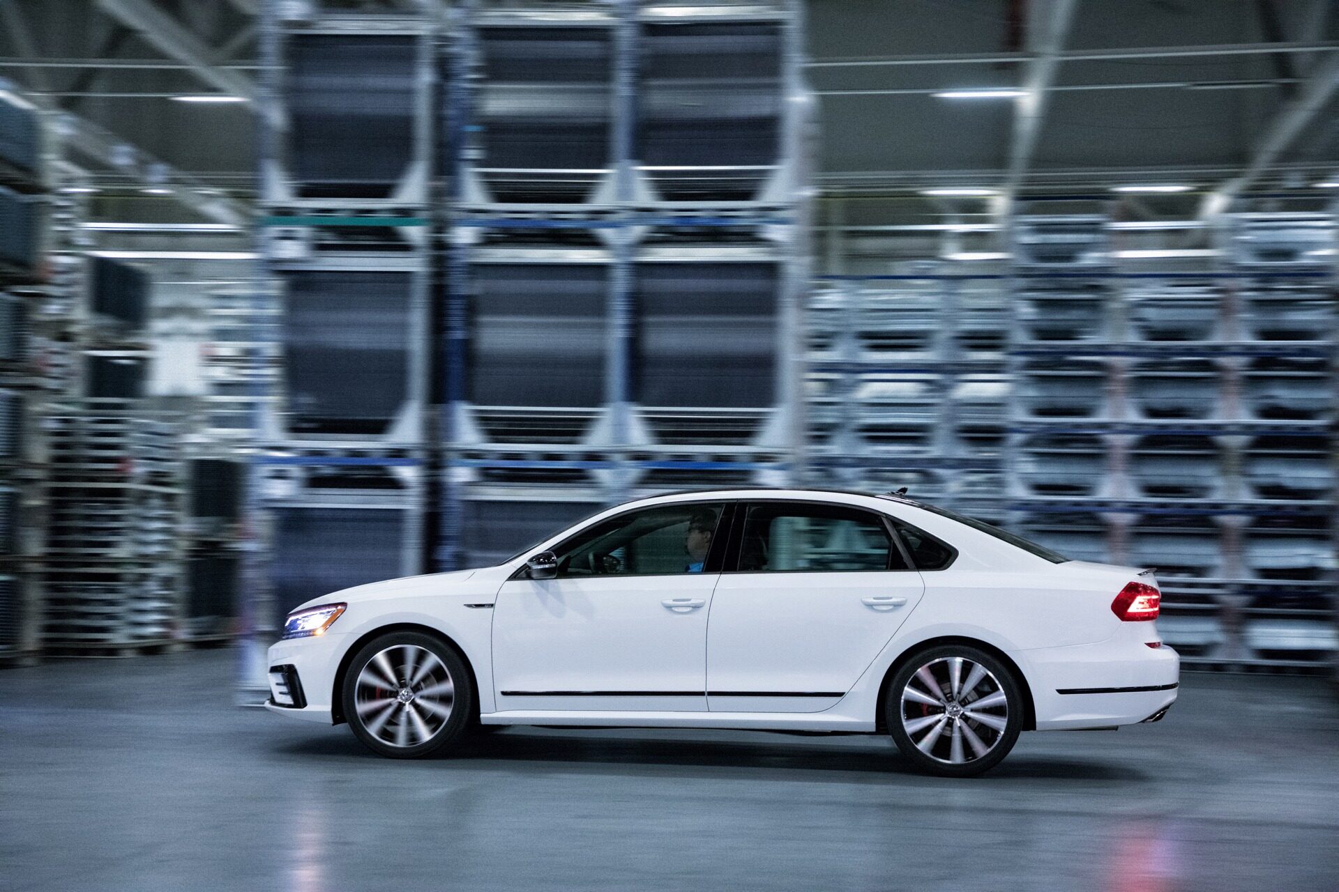 A rolling side profile of the 2018 Passat GT in White Silver shows the sedan's sport-tuned stance, GT-exclusive body side moldings, and 19-inch two-tone alloy wheels with red brake calipers. The motion-blur factory setting gives the shot a dynamic feel.