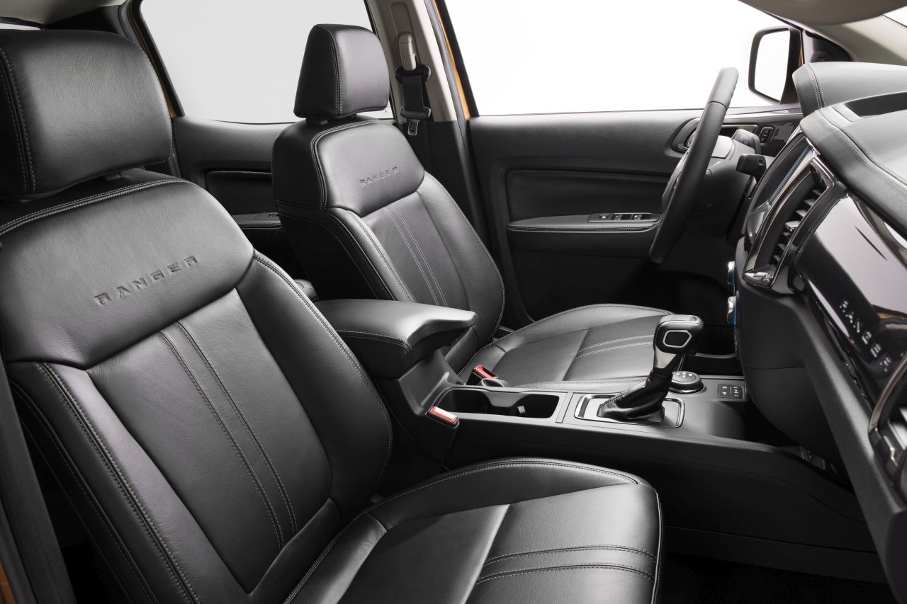 The 2019 Ford Ranger Lariat's leather-trimmed front seats feature RANGER embossing on the seatbacks and a center console with the 10-speed automatic shifter. The black leather interior and stitching detail represent the Lariat's premium cabin finish.