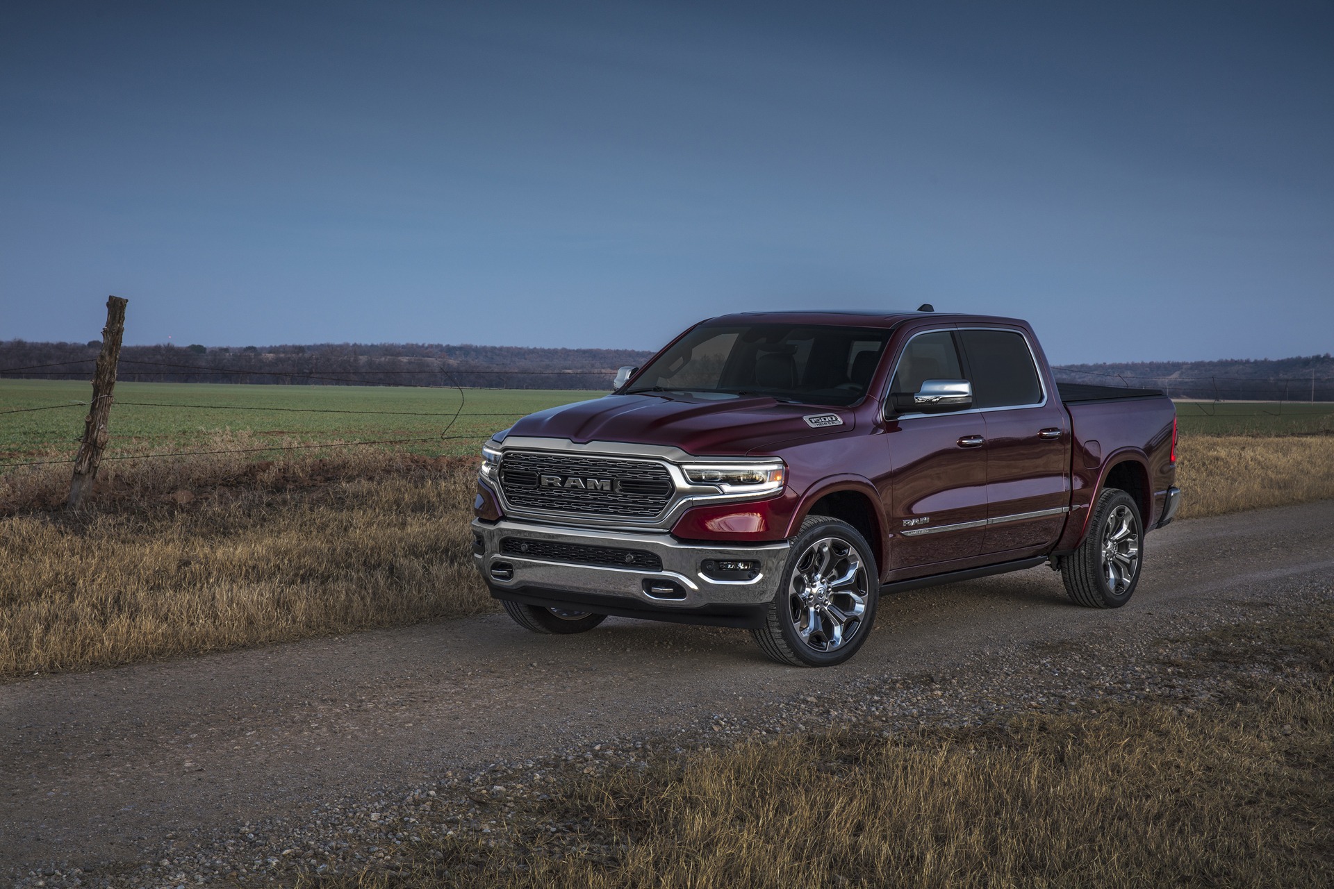 The 2019 Ram 1500 Limited sits on a rural dirt road flanked by dry winter fields, showing off the chrome grille surround, LED headlamps, and chrome side mirrors. This fifth-gen DT Ram 1500 received a 225-pound weight reduction over its predecessor despite growing in frame size.