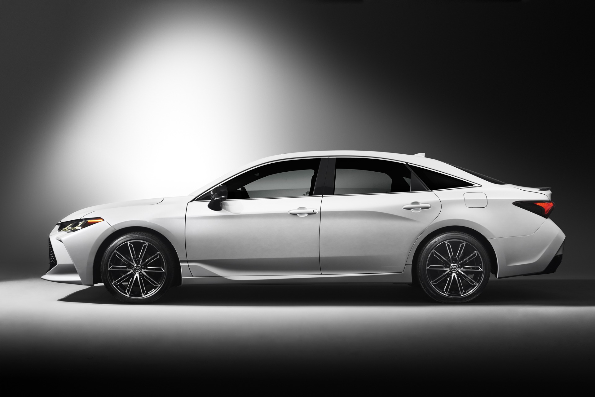The side profile of the 2019 Toyota Avalon Touring in white shows the long, low-slung silhouette of the TNGA-K platform design, with a sweeping roofline and large multi-spoke wheels. The dramatically lower beltline and longer hood create a sportier presence than previous generations.