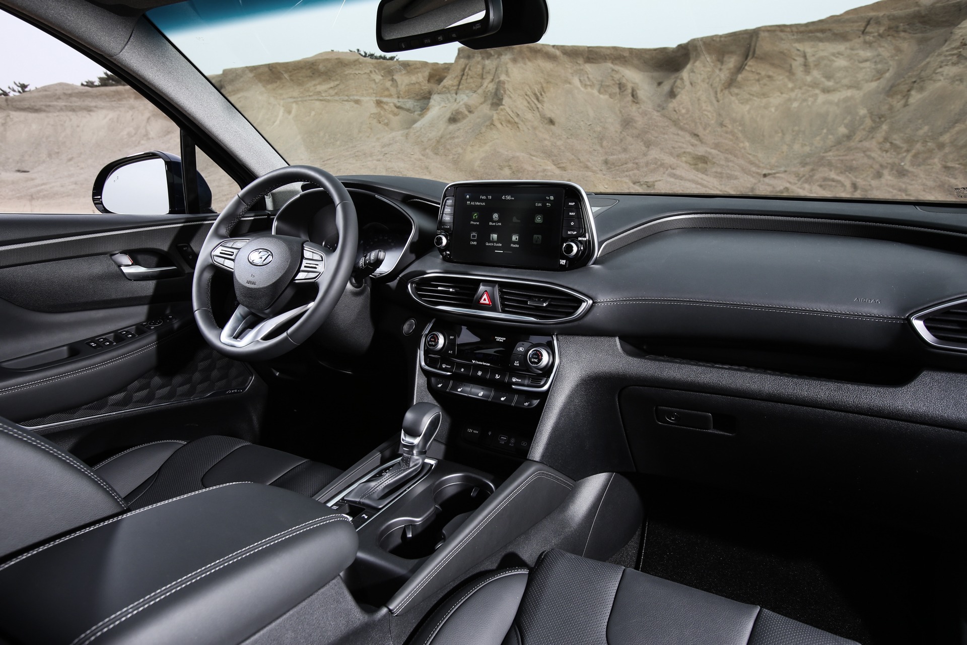 The Santa Fe's driver-focused cockpit features a large touchscreen infotainment display, a sculpted center console, and black leather seating with contrast stitching. The dashboard design balances driver convenience with front passenger accessibility.