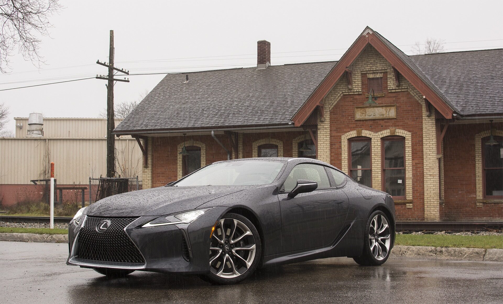 The 2018 Lexus LC 500 is photographed from a front three-quarter angle on a rainy day beside a historic brick train depot. The wet pavement reflects the car's dramatic body lines, and the spindle grille and multi-spoke alloy wheels stand out prominently.