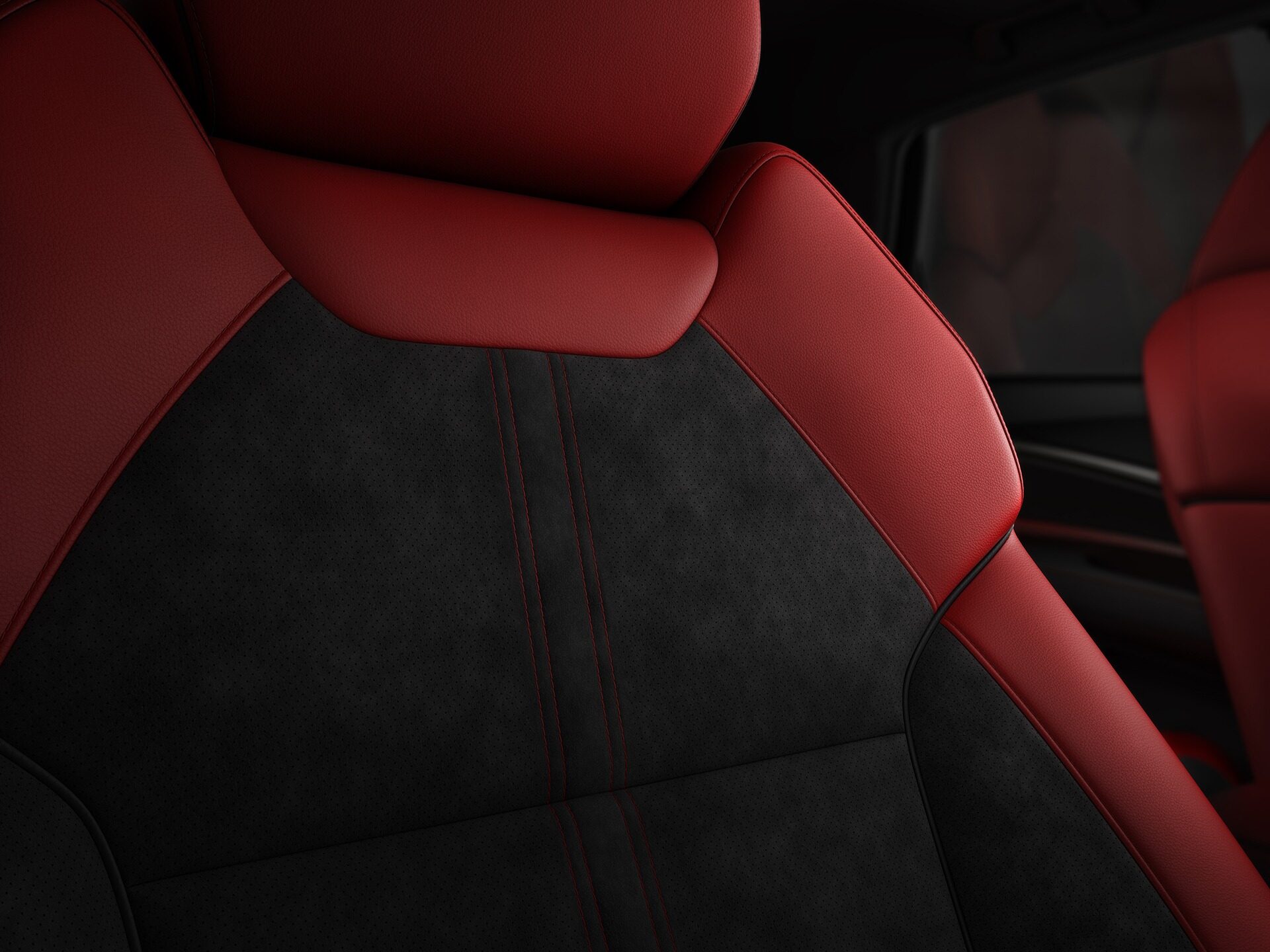 A close-up detail shot of the 2019 Acura MDX A-Spec sport seat shows the two-tone red leather bolsters contrasted with black Alcantara center inserts and red accent stitching. The premium materials highlight the sportier interior treatment offered on the A-Spec package.