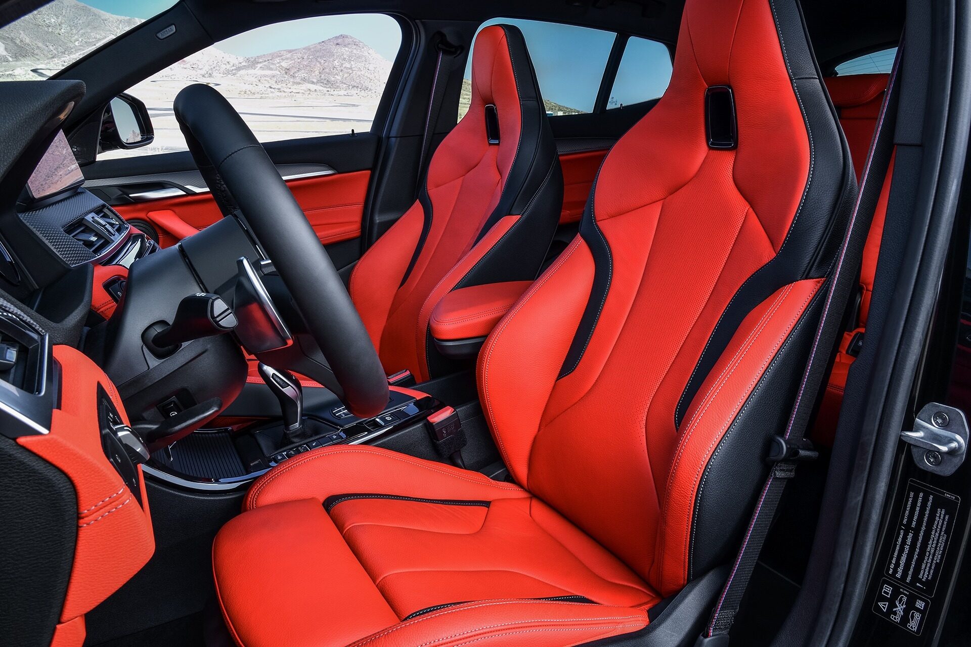 The front seats of the 2019 BMW X2 M35i are shown in vivid red leather with contrasting black bolsters and M Sport stitching. The heavily contoured sport seats provide excellent lateral support, and the view through the windows shows the desert landscape outside the parked crossover.