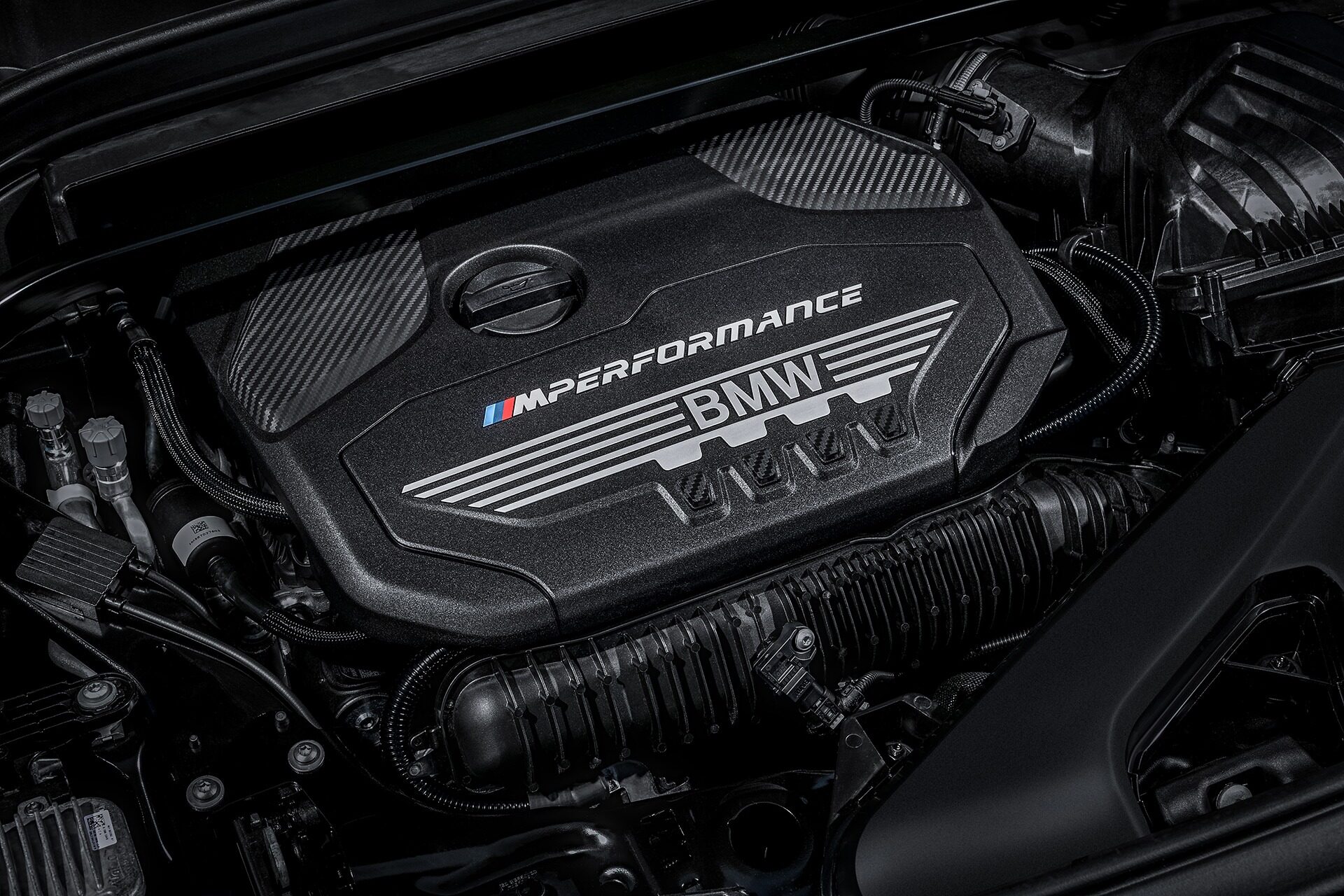 The engine bay of the 2019 BMW X2 M35i reveals the M Performance-badged 2.0-liter turbocharged four-cylinder engine, which produces 301 horsepower. The carbon fiber-look engine cover prominently displays the M Performance and BMW logos, signaling this crossover's performance credentials under the hood.