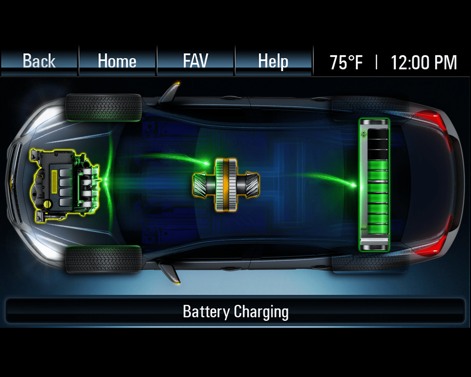 MyLink touchscreen in the 2013 Chevrolet Malibu Eco showing the eAssist system's real-time battery charging diagram, illustrating energy flow between the 2.4L engine, belt-alternator-starter, and lithium-ion battery.