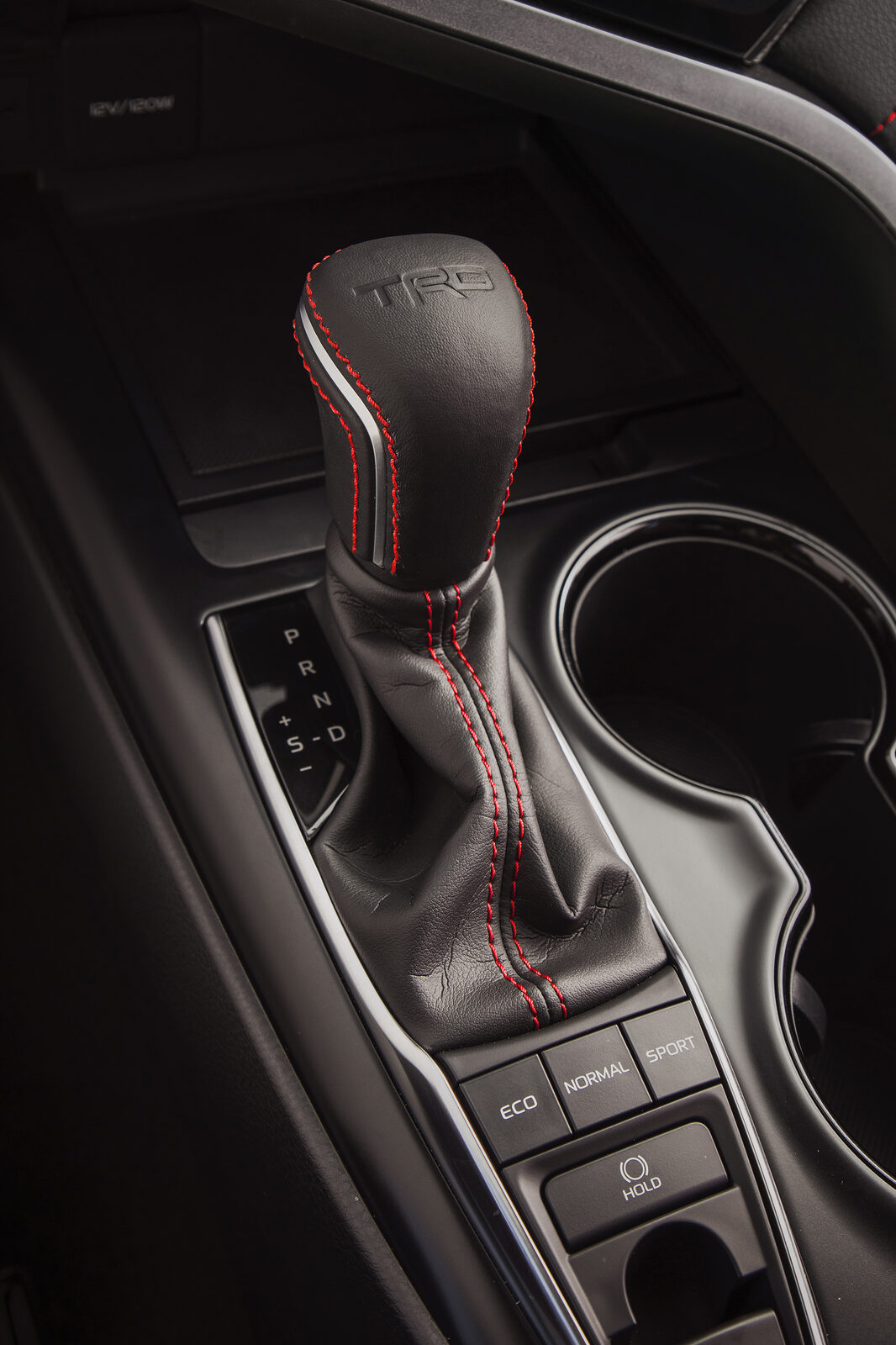 The 2020 Toyota Camry TRD's leather-wrapped shift knob wears the TRD logo proudly, its red contrast stitching echoed throughout the cabin while ECO, Normal, and Sport drive mode selectors sit ready below, giving drivers easy access to the chassis tuning that makes this TRD variant stand apart.