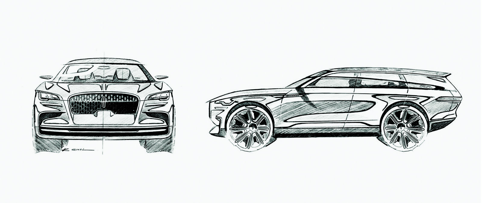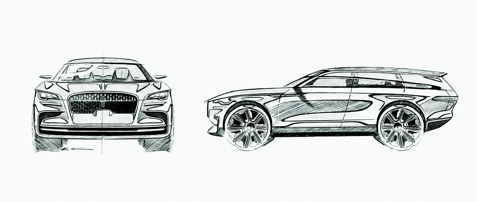 Official design sketches for the 2020 Lincoln Aviator show the front three-quarter and side profile views that guided the production SUV's development. The sketches reveal the prominent grille, sweeping roofline, and proportions that translated faithfully from concept to production.