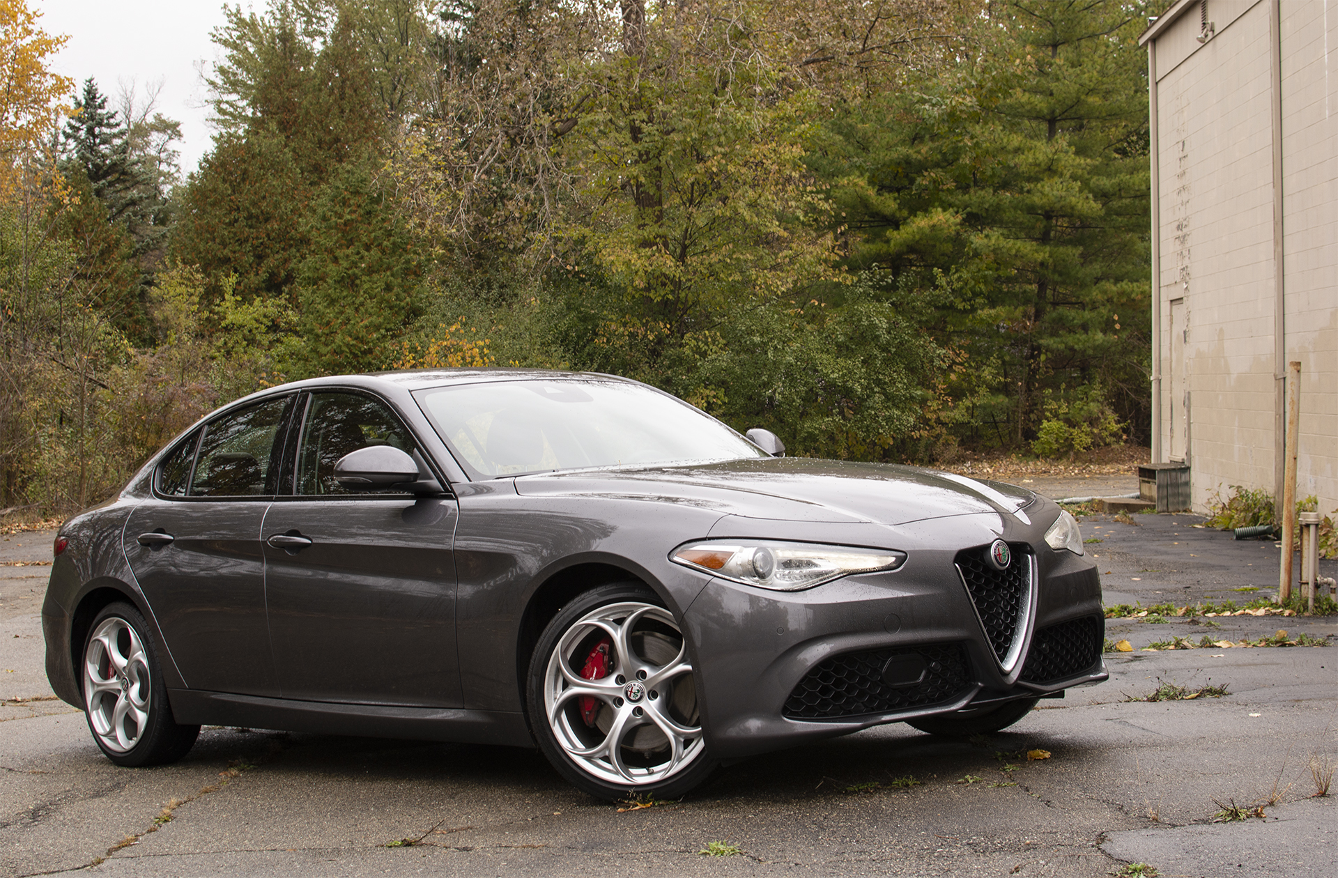 The 2018 Alfa Romeo Giulia Ti Sport Q4 photographed from the front three-quarter angle, showcasing the sculpted hood, wide front track, and red brake calipers peeking through the 19-inch wheels. Fall foliage provides a natural backdrop for the gray exterior.