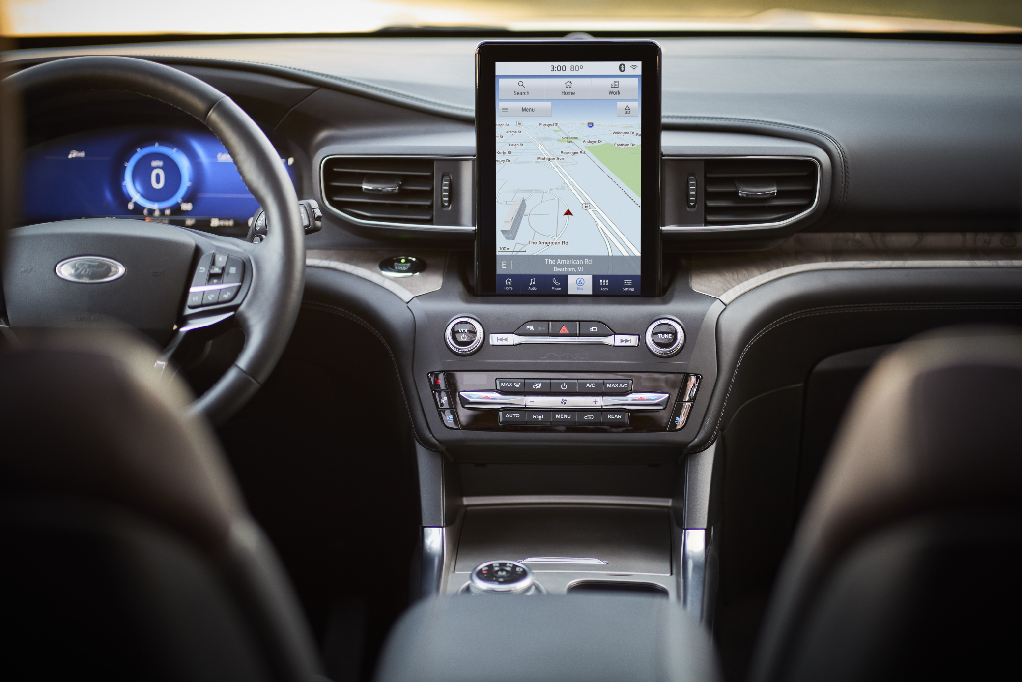 The interior of the 2020 Ford Explorer Platinum shows the full-width dashboard with a large portrait SYNC 3 touchscreen at center, digital instrument cluster visible through the steering wheel, and black leather-trimmed seats. The driver-focused layout and premium materials reflect the Platinum trim's luxury positioning.