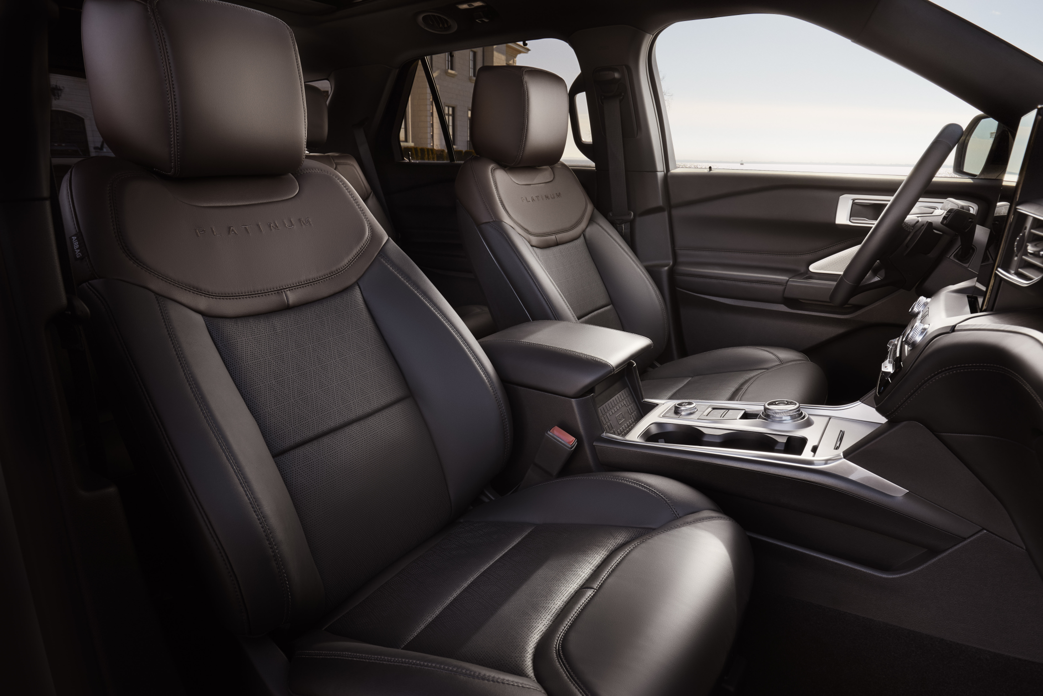 The front seats of the 2020 Ford Explorer Platinum are upholstered in dark leather with the Platinum logo embossed on the headrests and contrast stitching throughout. The captain's chair-style seats flank a center console with rotary gear selector and storage, creating a premium SUV cabin environment.