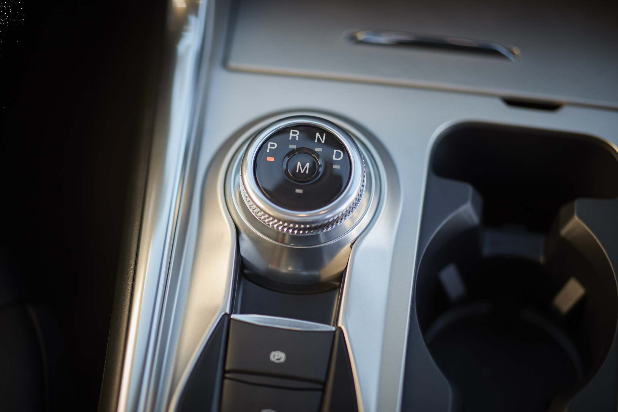 A close-up of the 2020 Ford Explorer Platinum's rotary gear selector showing the P, R, N, D, and M positions on the dial. The knurled chrome rotary dial replaces a traditional shifter and sits alongside the electronic parking brake button and dual cup holders in the center console.