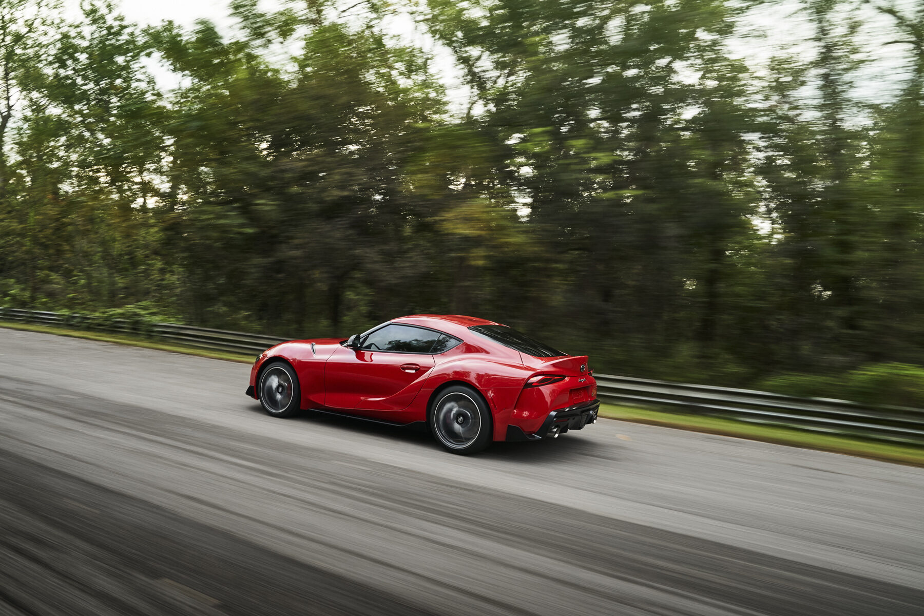 2020 Toyota GR Supra red rear three-quarter action shot at speed on track