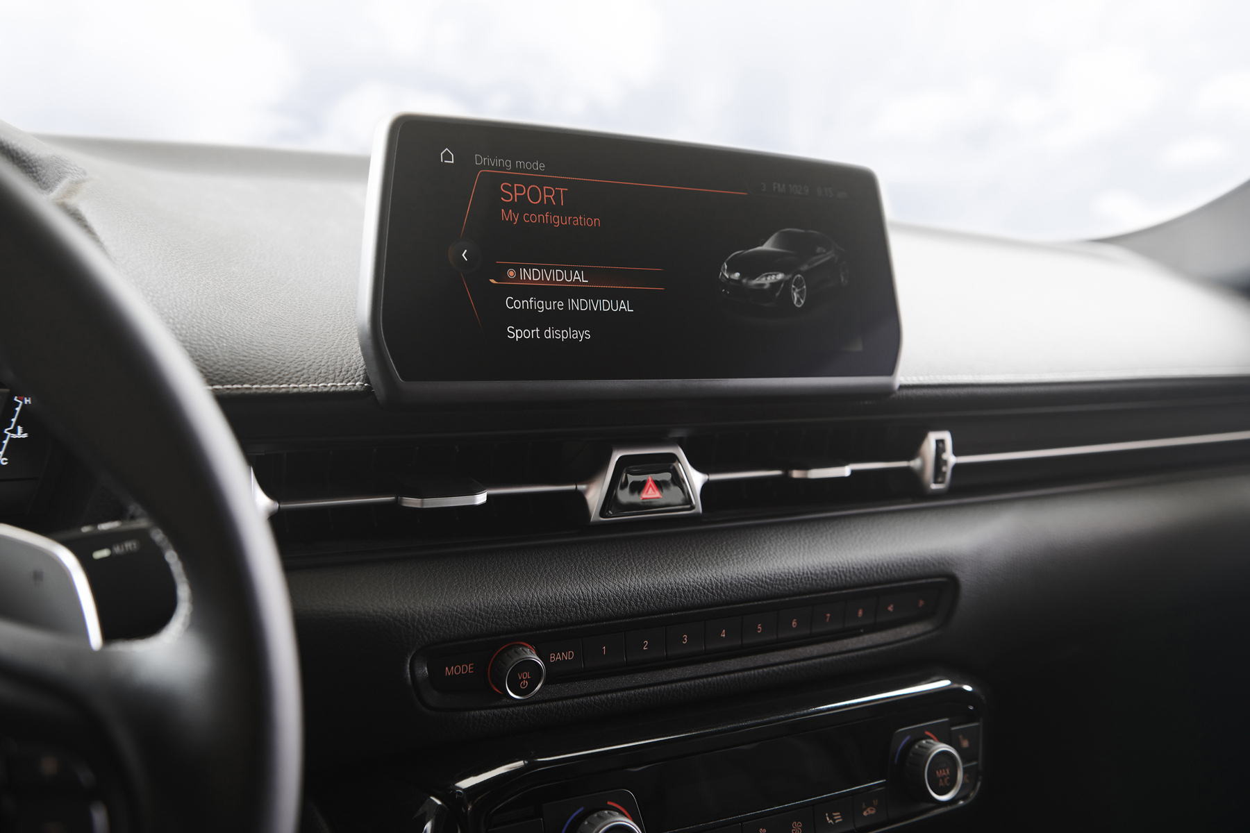 The infotainment screen in the 2020 Toyota GR Supra displays the driving mode selector set to Sport with the Individual configuration option highlighted, alongside climate controls and audio controls below the widescreen display.