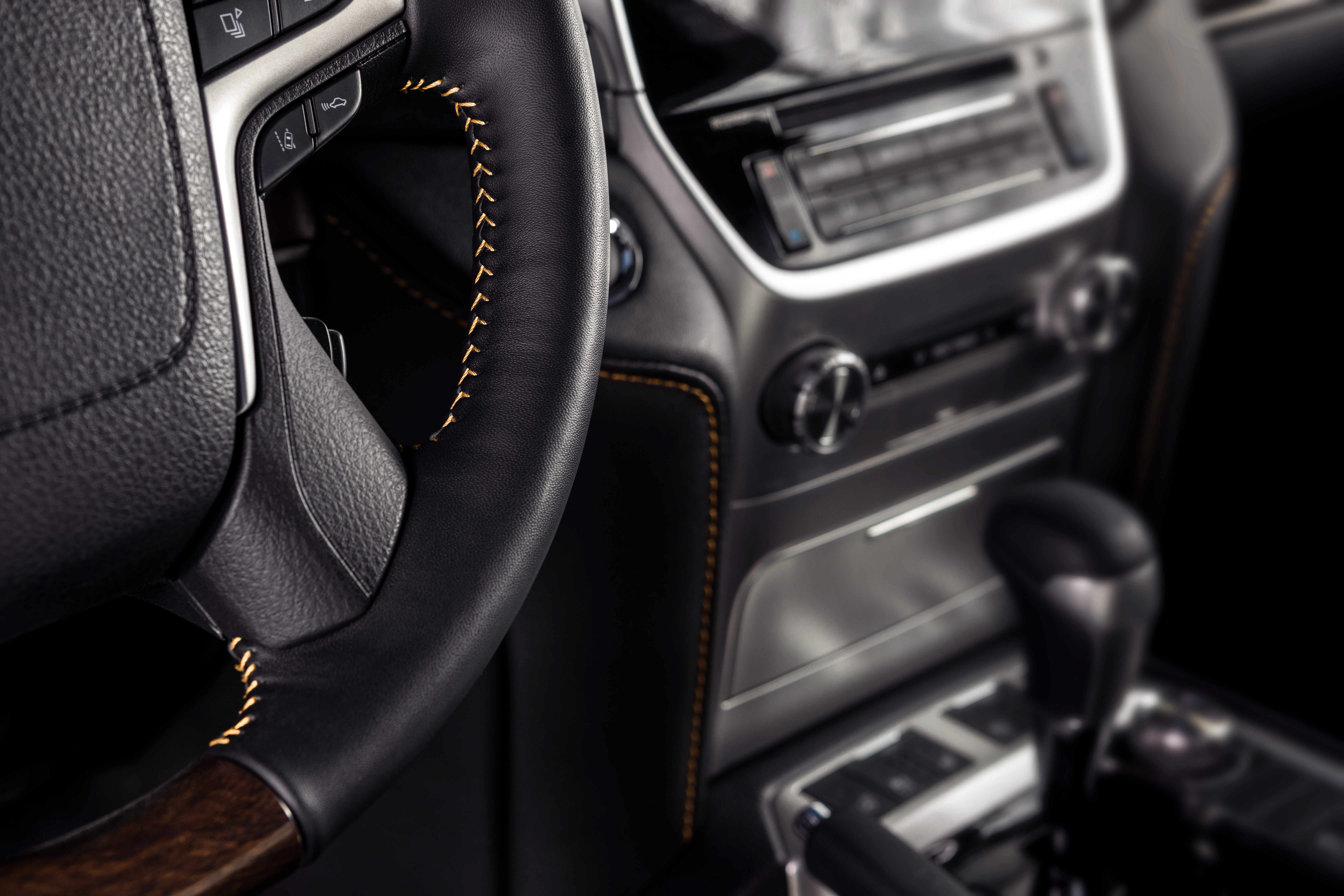 2020 Toyota Land Cruiser Heritage Edition, steering wheel with orange contrast stitching and center console detail