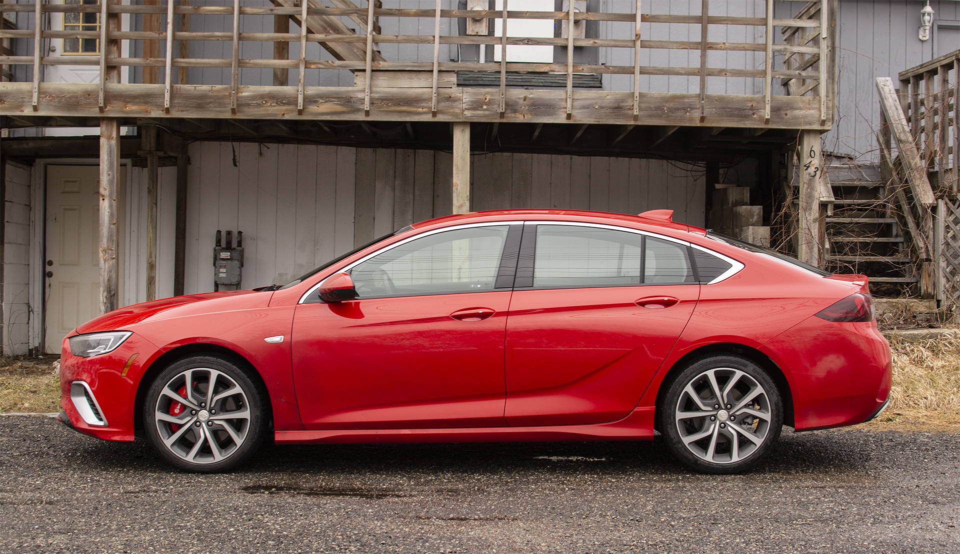 The side profile of the 2019 Buick Regal GS Sportback shows the sloping fastback roofline that sets it apart from a traditional sedan. Low-profile sport tires, red-painted brake calipers, and dark alloy wheels reinforce the GS performance intent.