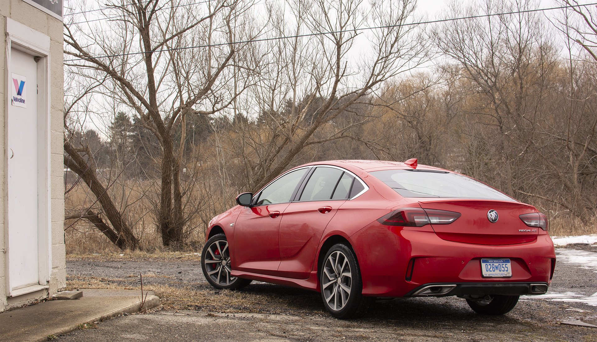 The three-quarter rear angle of the 2019 Buick Regal GS highlights the sweeping fastback roofline that defines the Sportback body style. Wide LED taillamps and twin exhaust outlets give the rear a purposeful, sport-tuned appearance.
