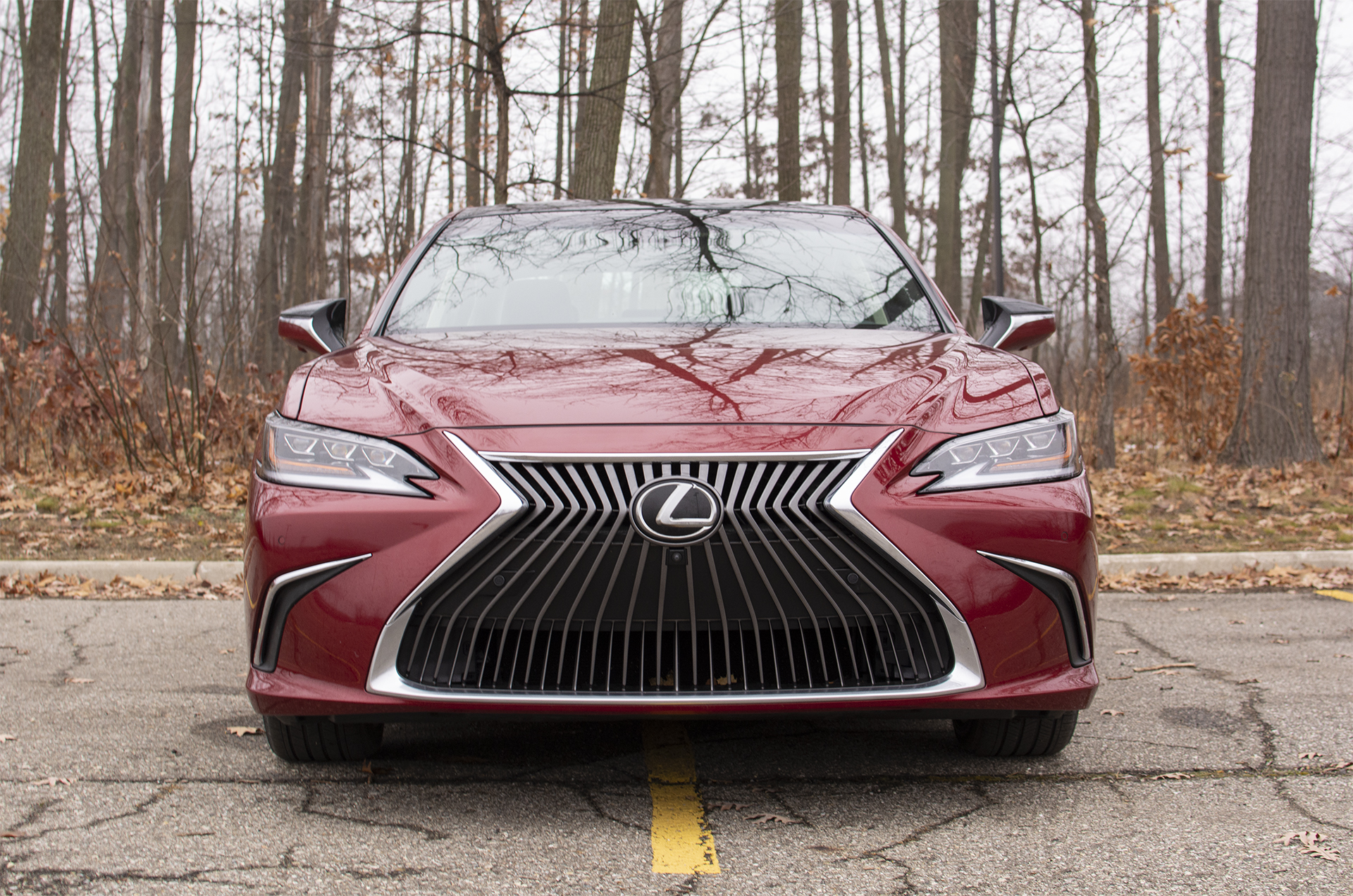 The all-new 7th-generation 2019 Lexus ES 350 shows off its bold spindle grille and sharp triple-LED headlights in this straight-on front view. The wider, lower stance on the TNGA-K platform gives the ES a far more athletic presence than its predecessor.