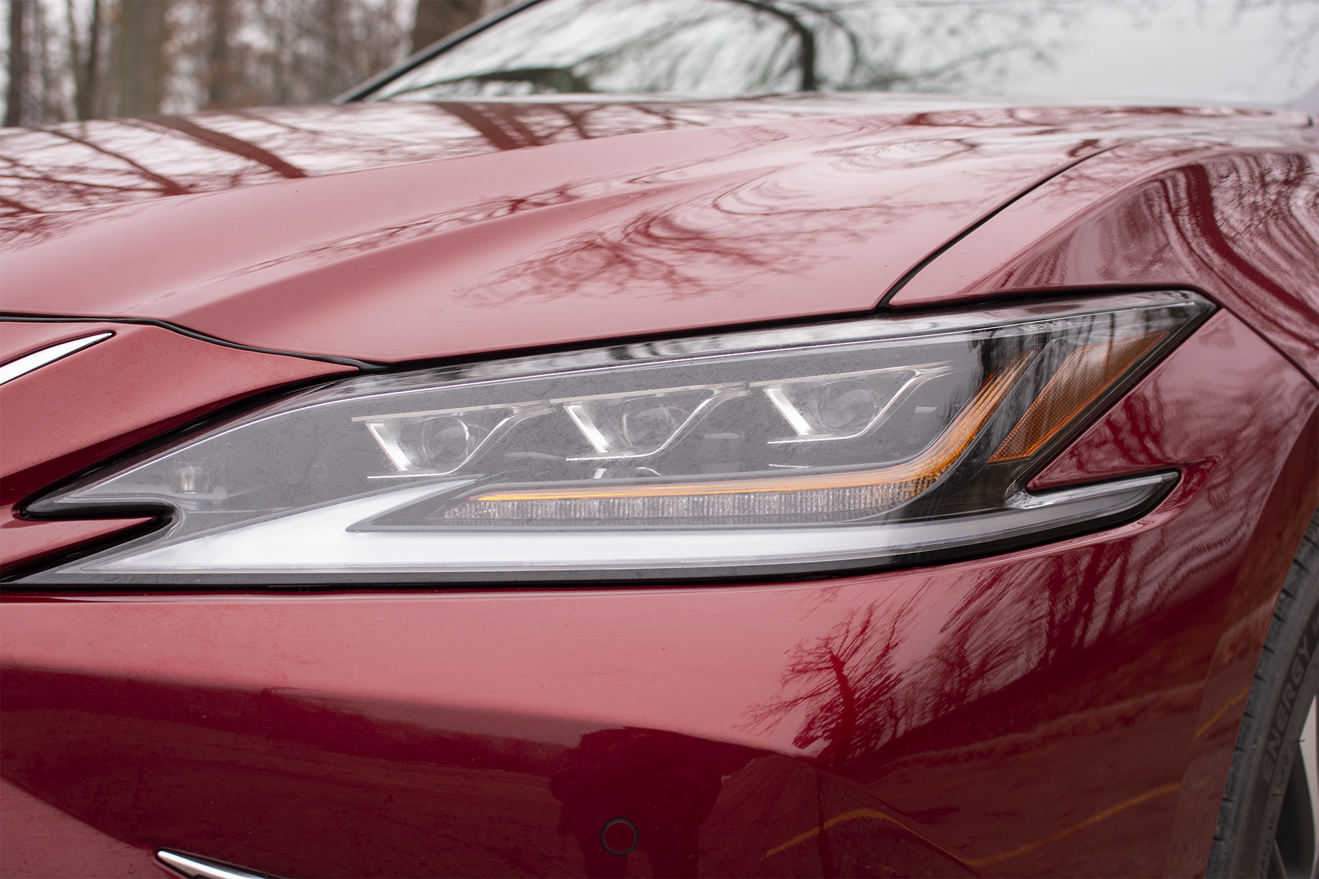 A close-up of the 2019 Lexus ES 350's triple-beam LED headlight shows the sharp, angular signature that defines the 7th-generation exterior design. The slanted profile and L-shaped daytime running light give the ES an aggressive yet refined appearance.