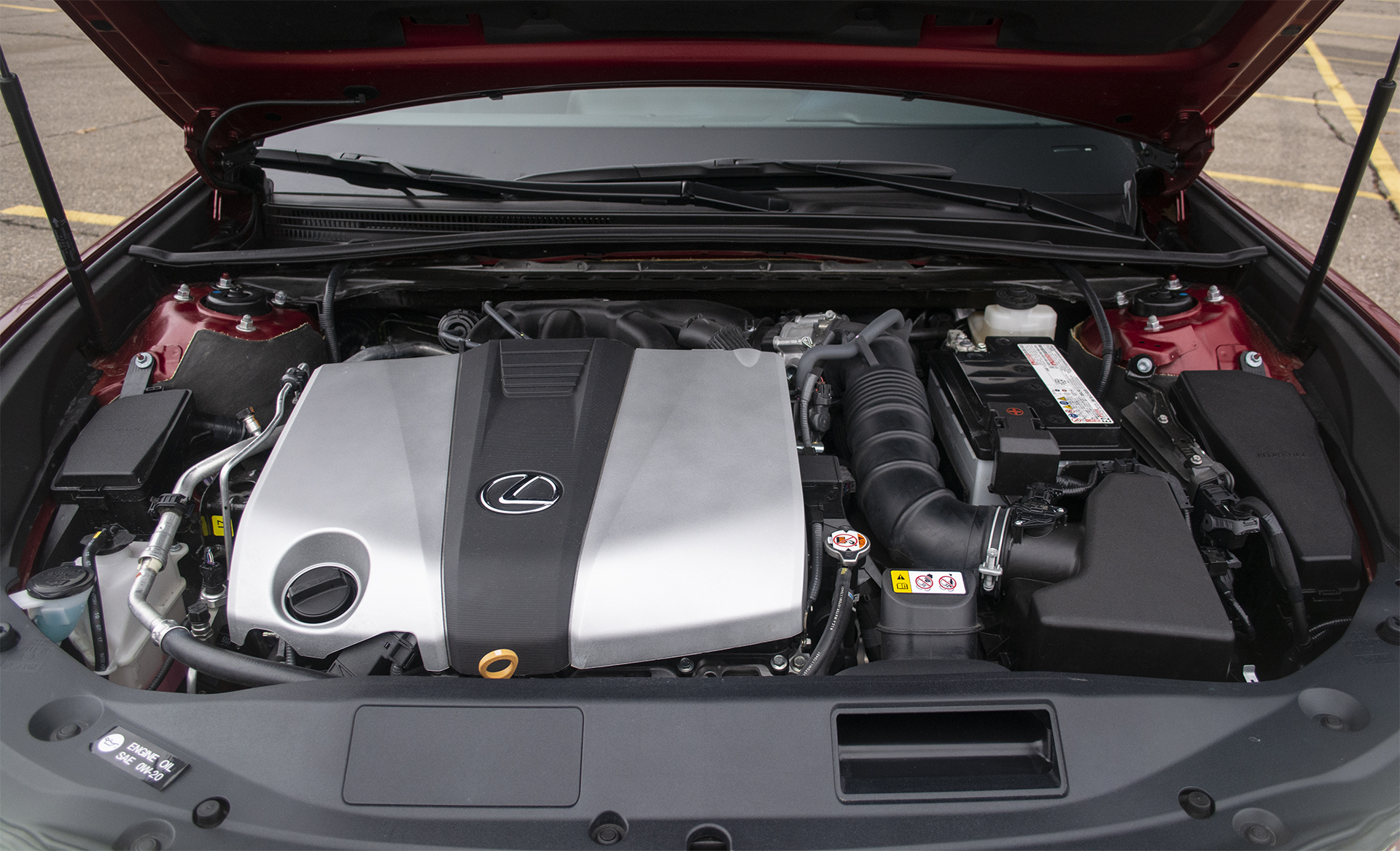 The ES 350's 3.5-liter V6 sits tidily under the hood, its Lexus-badged engine cover flanked by the usual collection of fluid reservoirs and wiring. The dark red paint visible at the edges of the engine bay hints at just how vibrant this Matador Red Mica color is when caught in proper light.