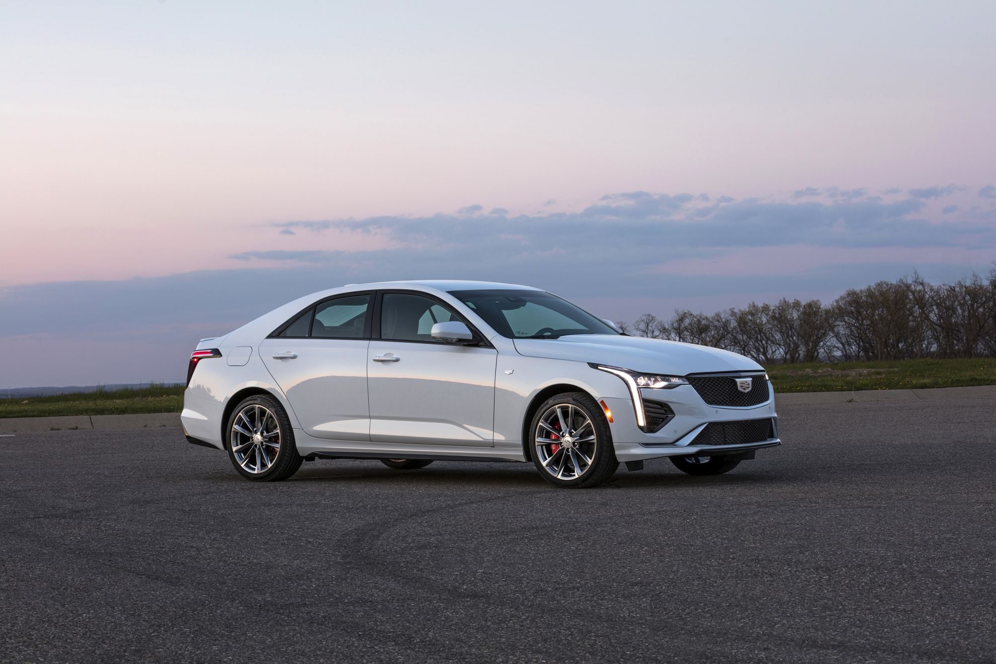 2020 Cadillac CT4-V front three-quarter view, white, at dusk