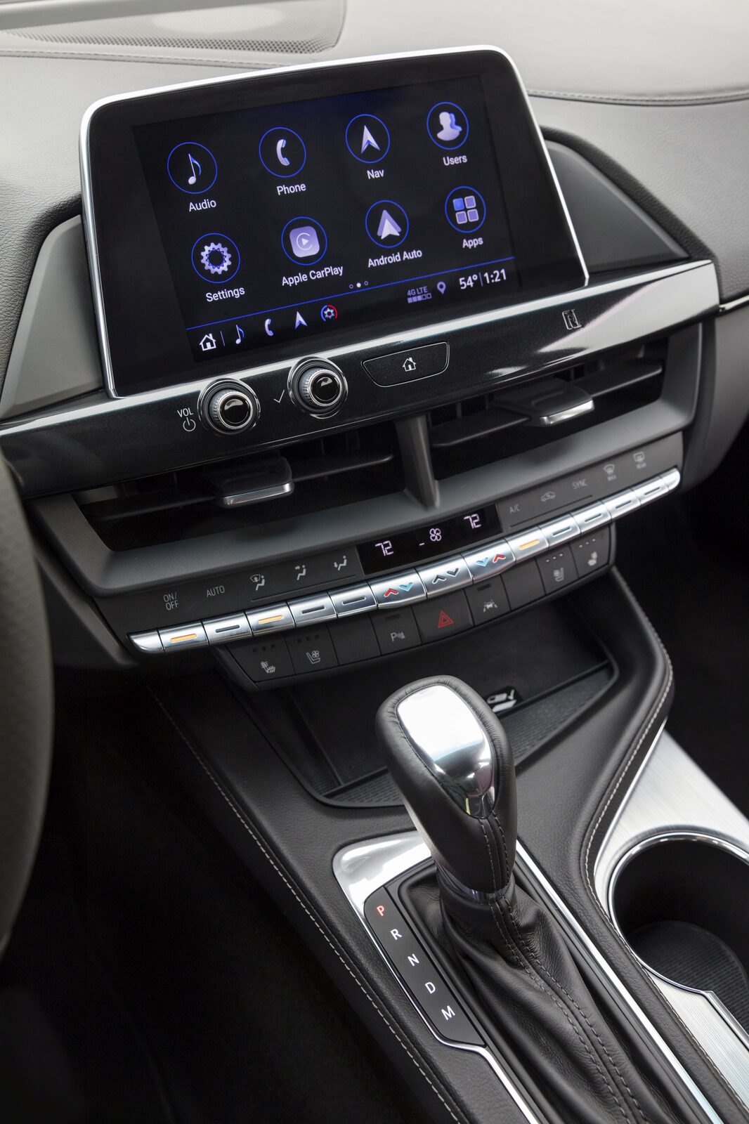 A vertical close-up of the 2020 Cadillac CT4's center console area, featuring the infotainment touchscreen displaying Apple CarPlay, along with the automatic gear selector, climate control buttons, and cup holder in a dark interior trim. The clean, modern layout emphasizes the sedan's technology-focused cabin.