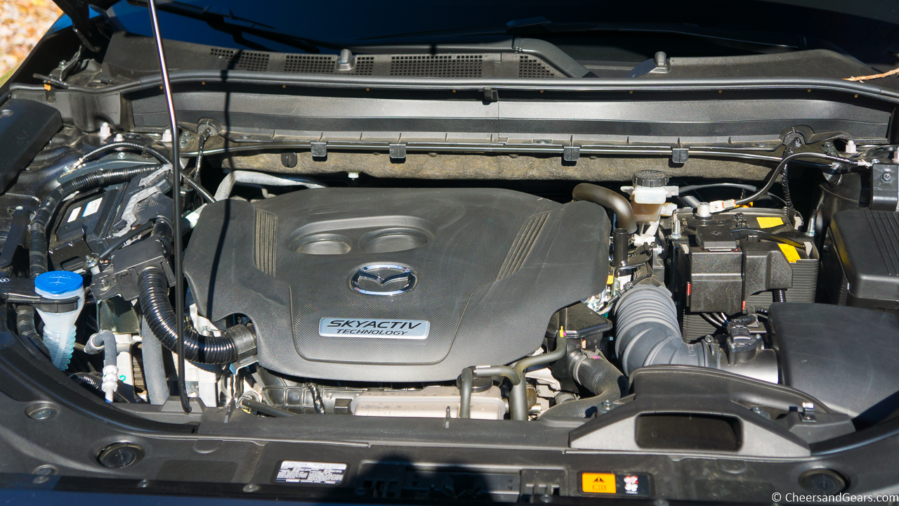 Under the hood of the 2019 CX-5 Signature sits a Skyactiv-branded engine, with the technology badge prominently visible on the engine cover. For 2019, Mazda offered the Signature with either the 2.5L SkyActiv-G turbocharged four-cylinder or the new 2.2L Skyactiv-D diesel.