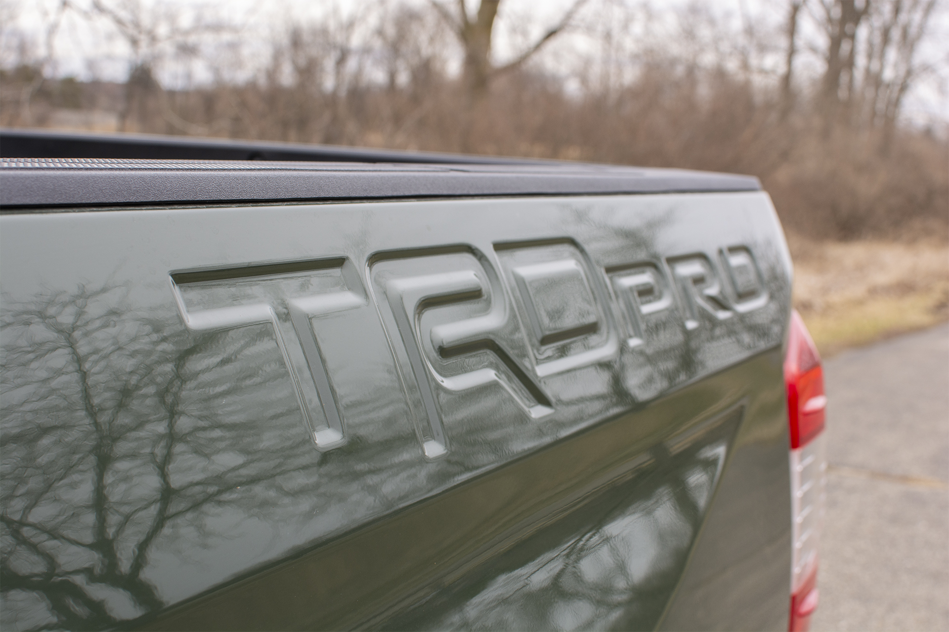 The raised "TRD PRO" lettering molded into the bed side of the 2020 Toyota Tundra TRD Pro CrewMax leaves no doubt about the trim level. The color-matched Army Green finish gives the badge a subtle but distinctive look.