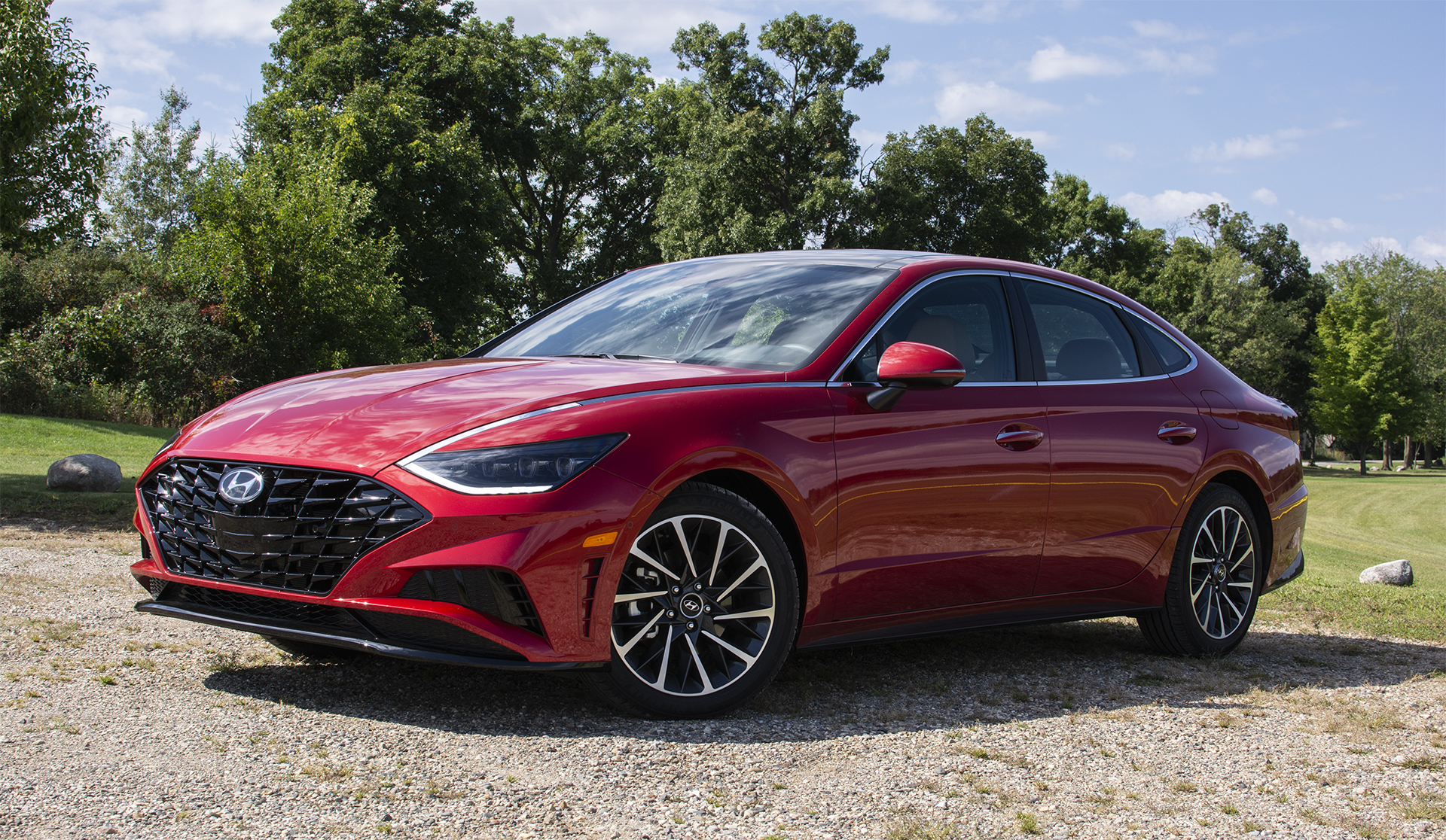 The 2020 Hyundai Sonata Limited 1.6T is shown from the front three-quarter angle, highlighting the dramatic diamond-mesh grille, sculpted hood, and coupe-like roofline in a deep red exterior. The overall proportions demonstrate how decisively Hyundai redesigned the eighth-generation Sonata to stand out in the midsize sedan segment.