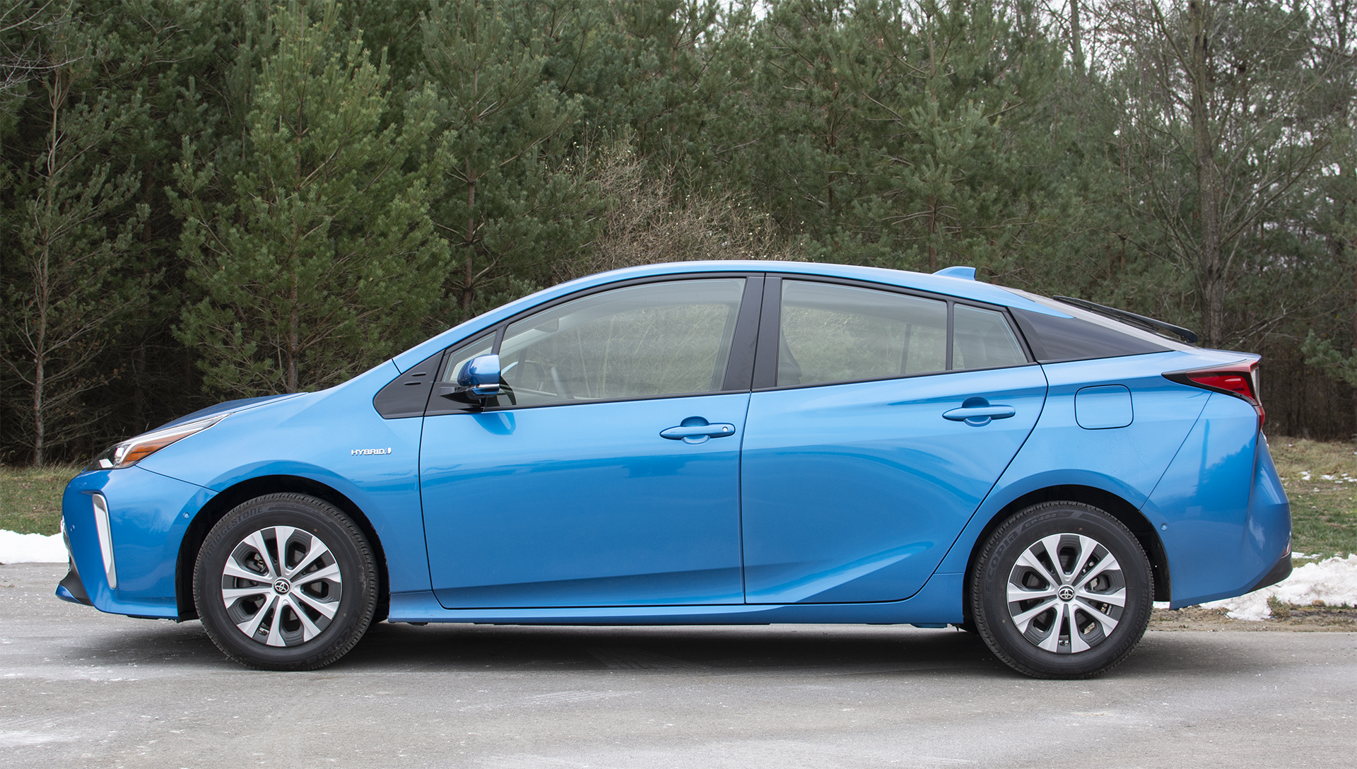 The side profile of the 2020 Toyota Prius XLE AWD-e highlights the distinctive liftback roofline and sculpted body panels in Blue Magnetism. The low-slung silhouette contributes to the Prius's aerodynamic efficiency and signature look.