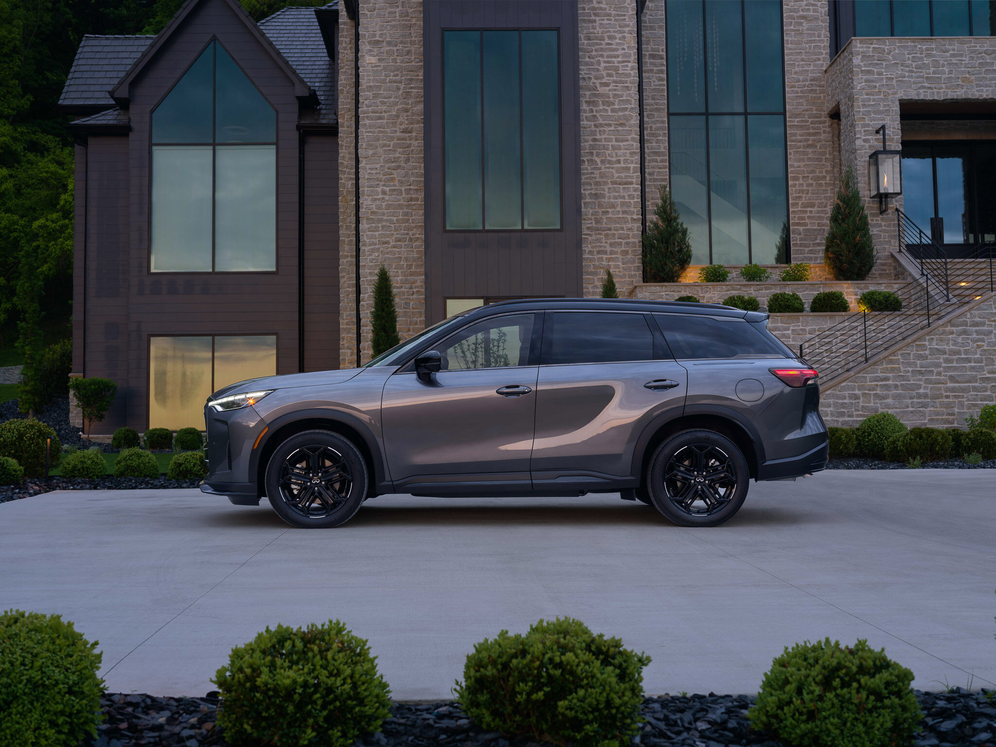 The passenger-side profile of the silver QX60 Sport at dusk shows its flowing shoulder line, blacked-out pillars, and muscular wheel arches set against a warm stone-and-glass estate.