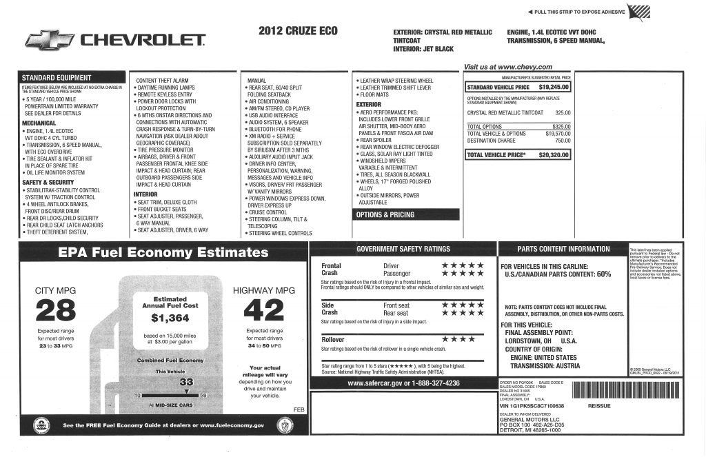 2012 Chevrolet Cruze Eco window sticker