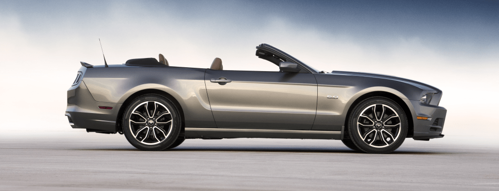 Clean side-profile studio shot of the 2013 Ford Mustang GT 5.0 Convertible in silver with the soft top lowered, revealing the tan leather interior and showcasing the long hood, short deck proportions and large machined multi-spoke wheels.