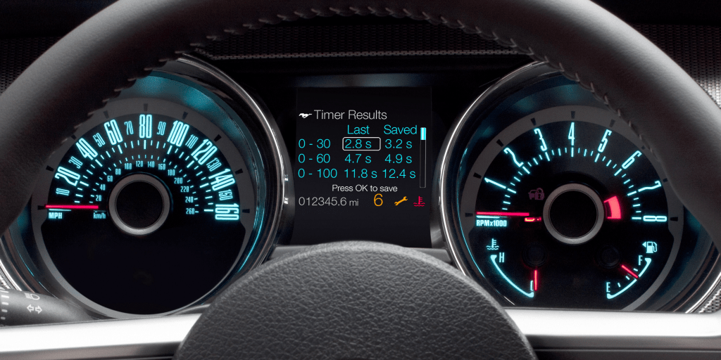 The 2013 Ford Mustang GT's Track Apps Timer Results screen displays 0-30, 0-60, and 0-100 MPH split times side-by-side with saved benchmarks, letting drivers instantly compare performance runs.