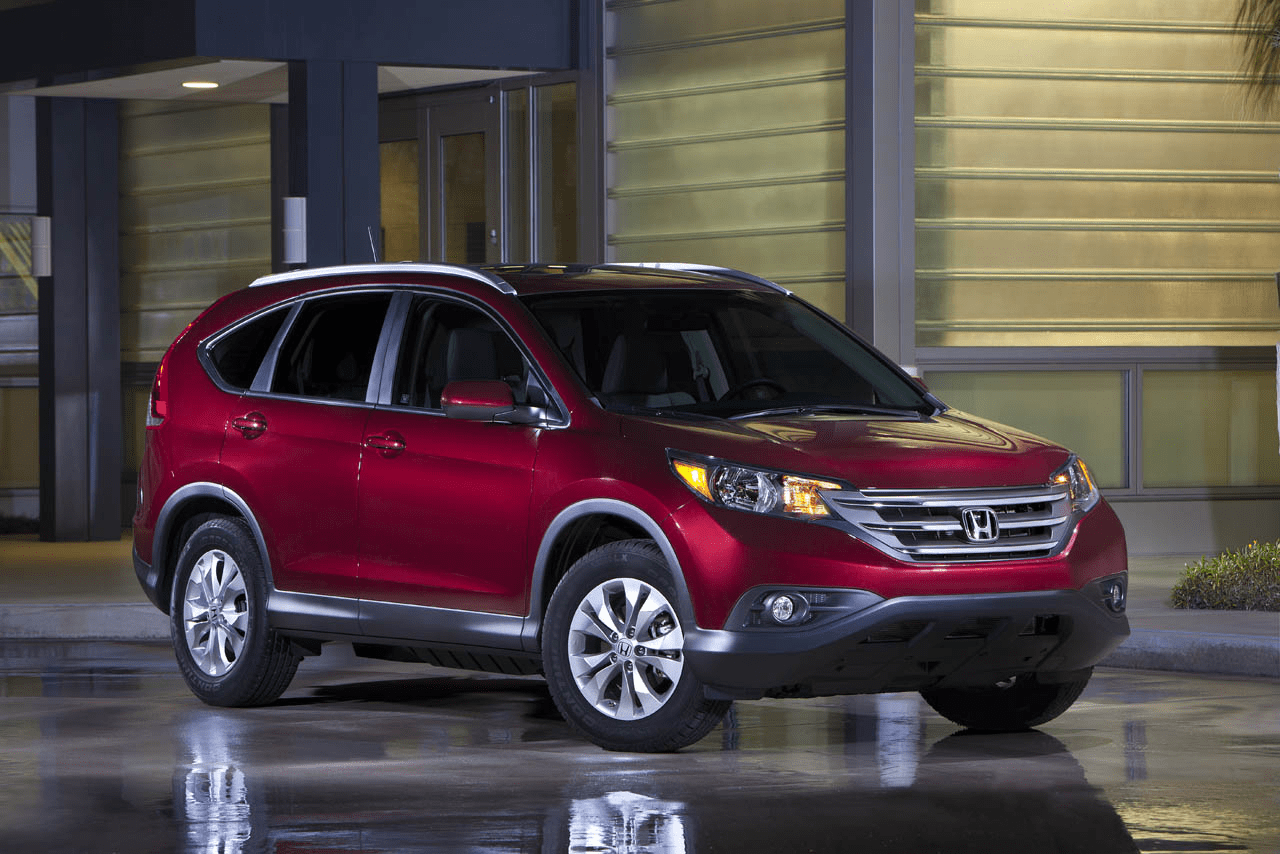 A more head-on front three-quarter view of the 2012 Honda CR-V at night, emphasizing the driver-side front corner with its swept headlights, chrome grille bars, and sculpted hood. Wet pavement and glass architecture in the background highlight the crossover's bold stance.