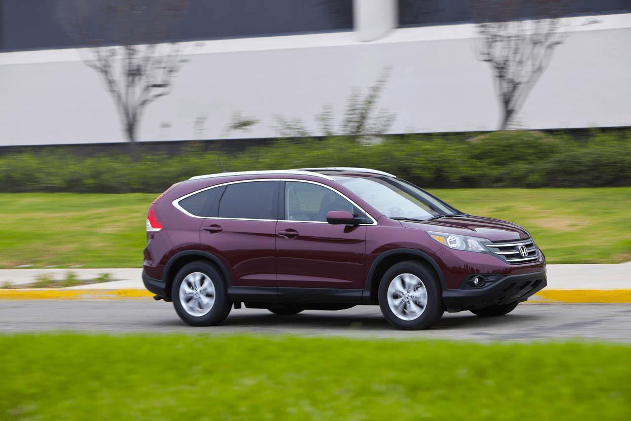 The 2012 Honda CR-V captured in motion from the driver side, showing the full profile of the fourth-generation crossover in a deep burgundy finish. The action shot highlights the roofline, door character lines, and five-spoke alloy wheels against a suburban backdrop.