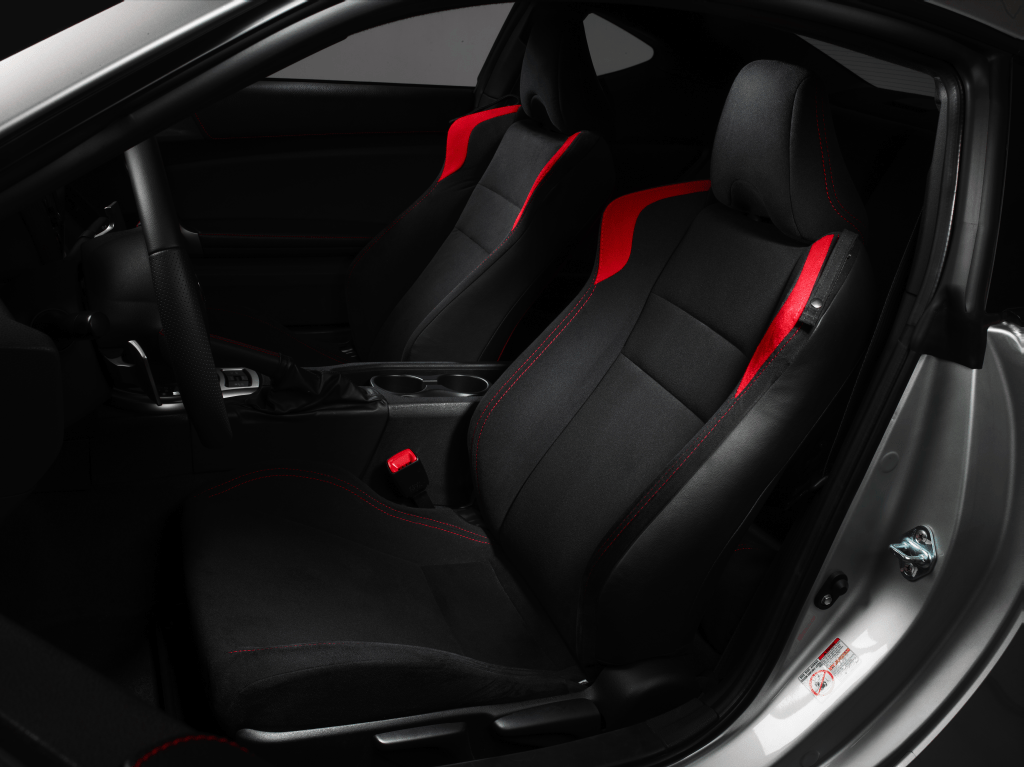View of the 2013 Scion FR-S front bucket seats with black and red bolster upholstery, shot from outside the open door.