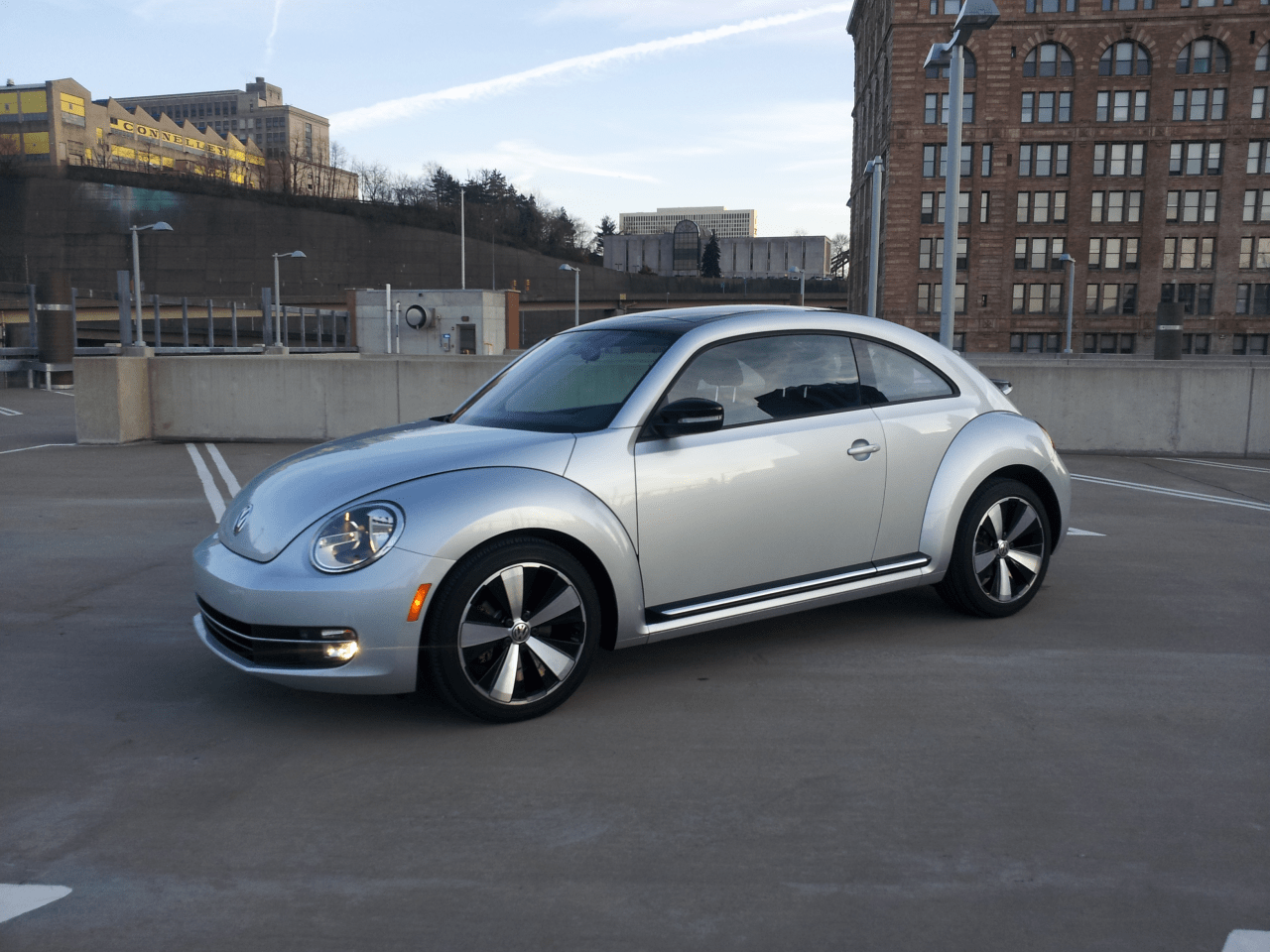 2012 Volkswagen Beetle Turbo front three-quarter view on Pittsburgh parking deck