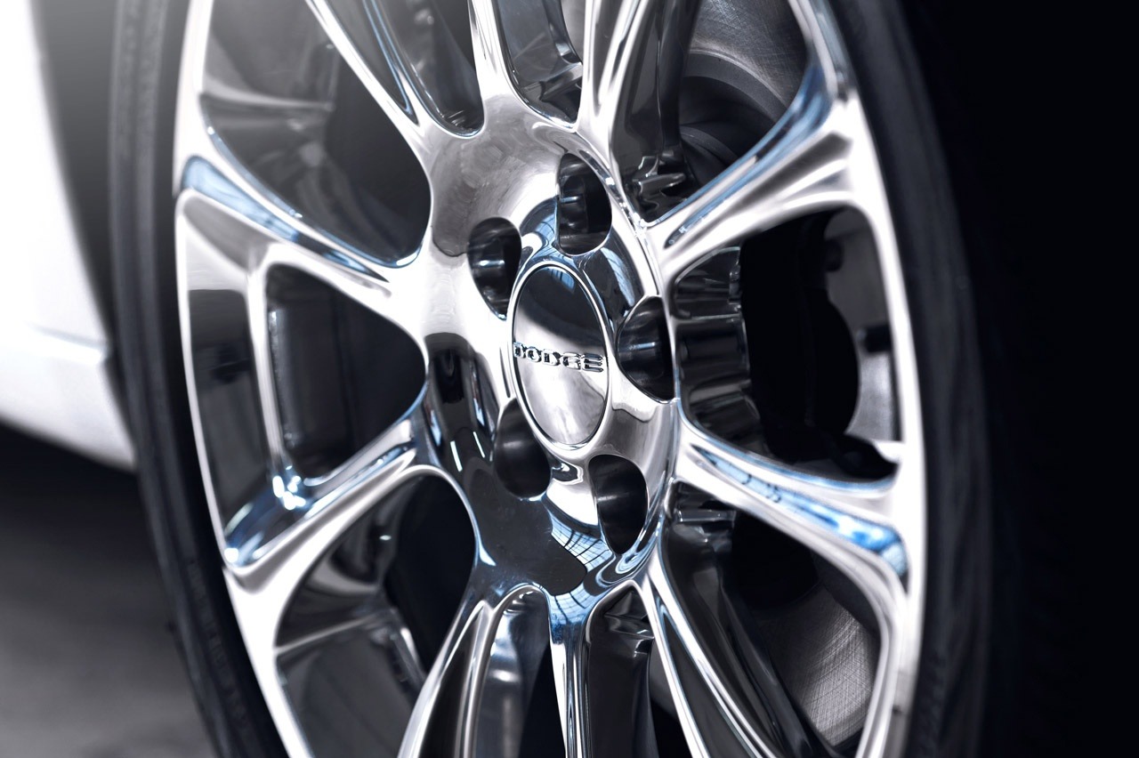 The 2013 Dodge Dart Limited's polished chrome multi-spoke alloy wheel features a Dodge center cap and delivers an upscale appearance consistent with the top trim level. Chrome clad alloy wheels were a distinguishing visual feature of the Limited on the white exterior.