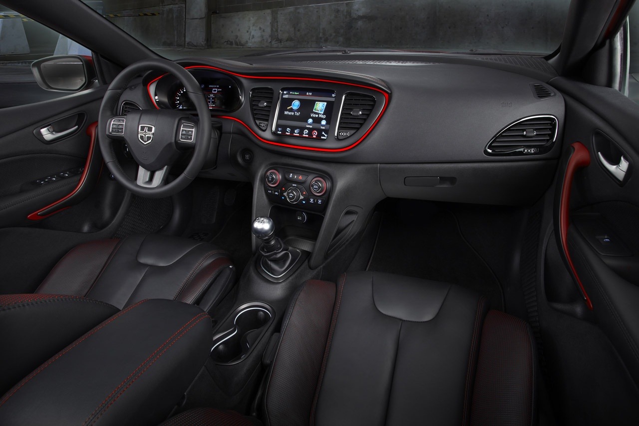 The 2013 Dodge Dart's cabin is shown from the rear passenger perspective, with the Uconnect navigation map displayed on the center touchscreen. Red ambient trim, black leather seating with red stitching, and the manual shifter define the interior atmosphere.