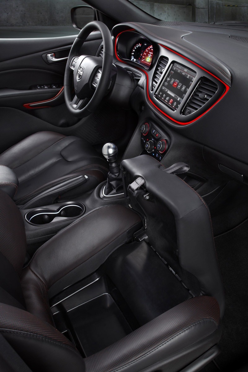 The 2013 Dodge Dart's front cabin is shown with the center console armrest folded up, revealing additional storage beneath. Black leather seating with red contrast stitching and the manual shifter are prominent in this view.
