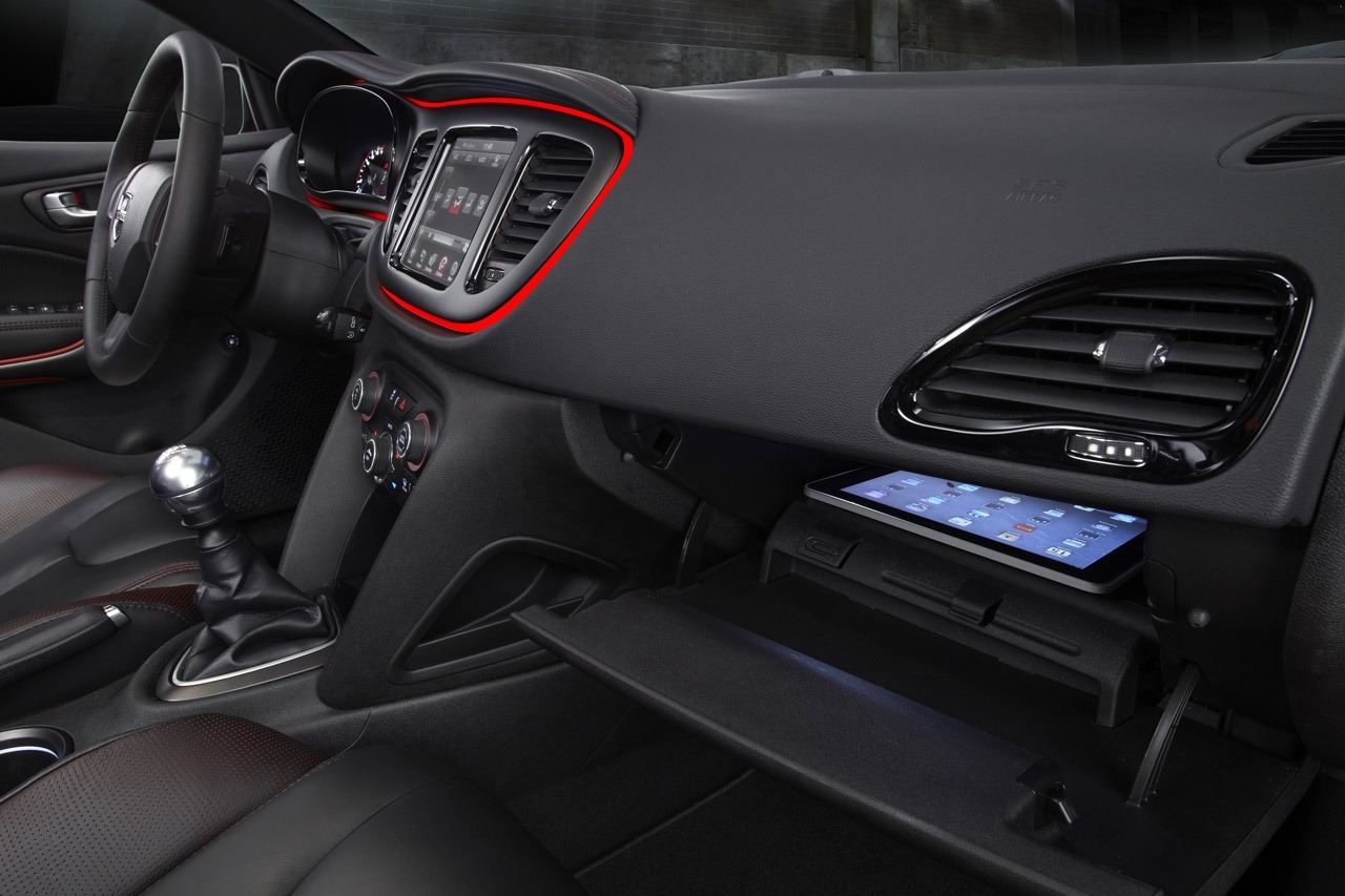 The passenger side of the 2013 Dodge Dart interior shows the dash-top tablet docking station, a unique feature that allowed owners to mount a personal tablet for navigation or entertainment. Red accent trim traces the contour of the instrument panel across the full width.