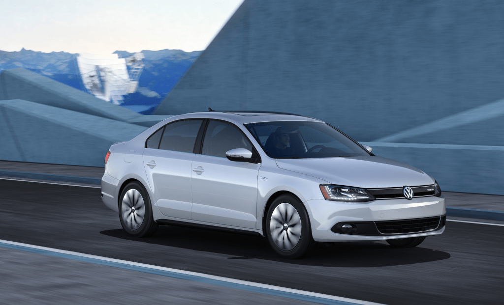 2013 Volkswagen Jetta Hybrid front three-quarter press photo with modern architectural backdrop