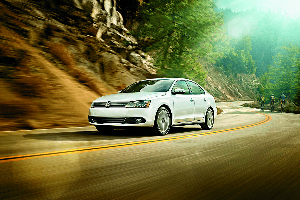 2013 Volkswagen Jetta Hybrid front three-quarter driving press photo on mountain road