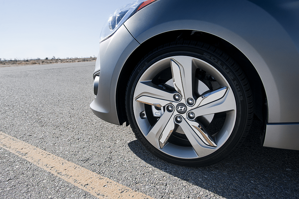 A close-up of the 2013 Hyundai Veloster Turbo's five-spoke polished alloy wheel on the front corner, with the headlight and silver body panel visible above. The low-profile tire and brake disc are clearly visible behind the spokes.