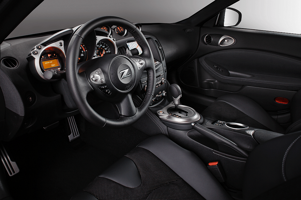 The driver's perspective inside the 2016 Nissan 370Z, capturing the Z-badged steering wheel, short-throw manual shifter flanked by a polished aluminum shift knob, and the amber-backlit analog instruments in the sport binnacle.