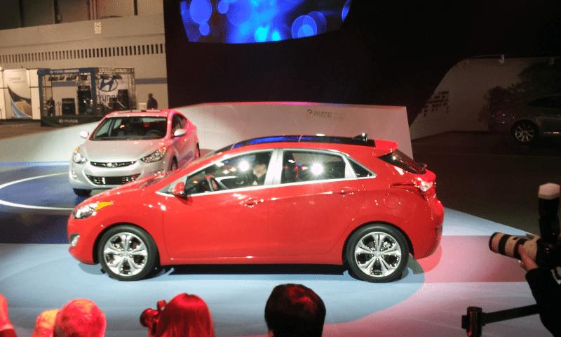 2013 Hyundai Elantra GT red side view with Coupe in background auto show